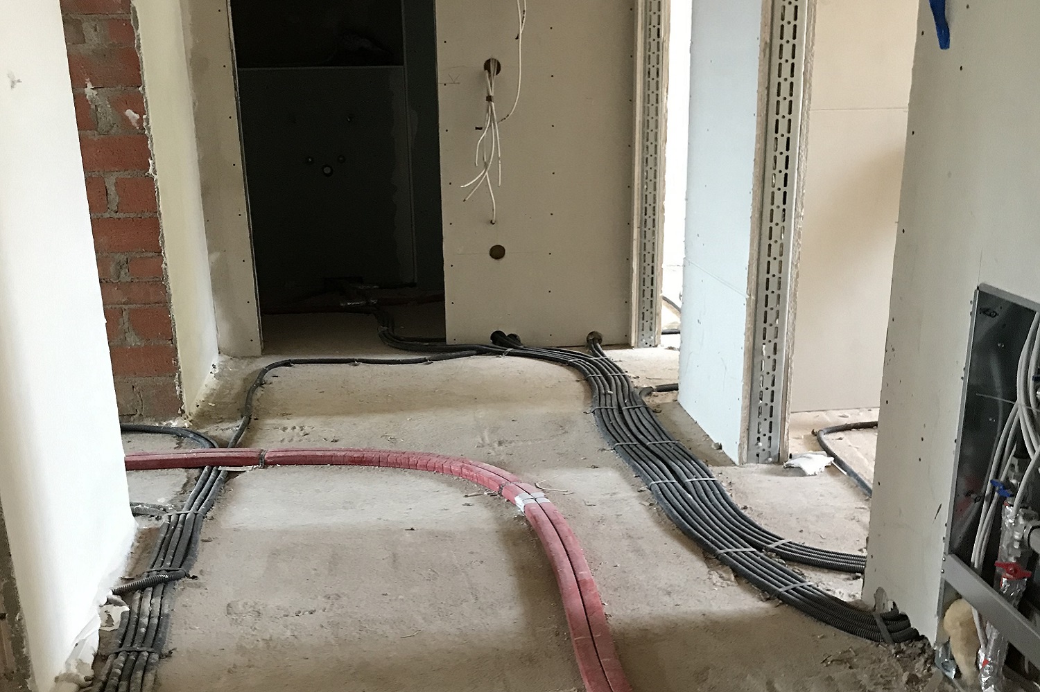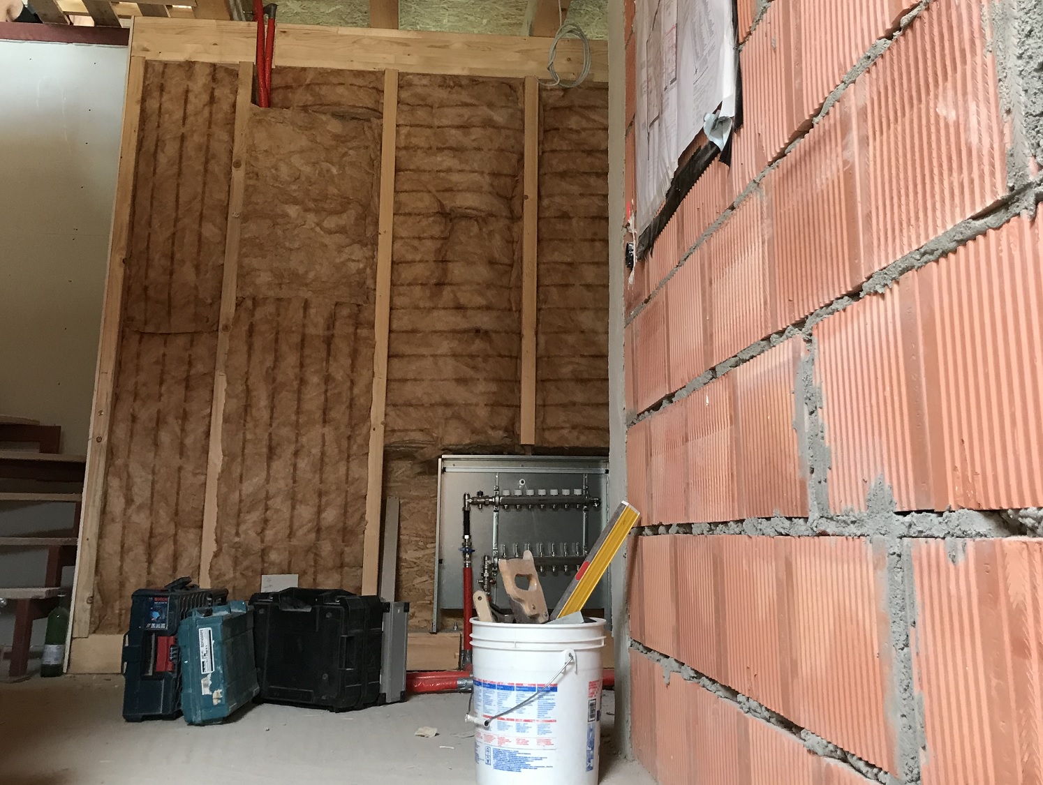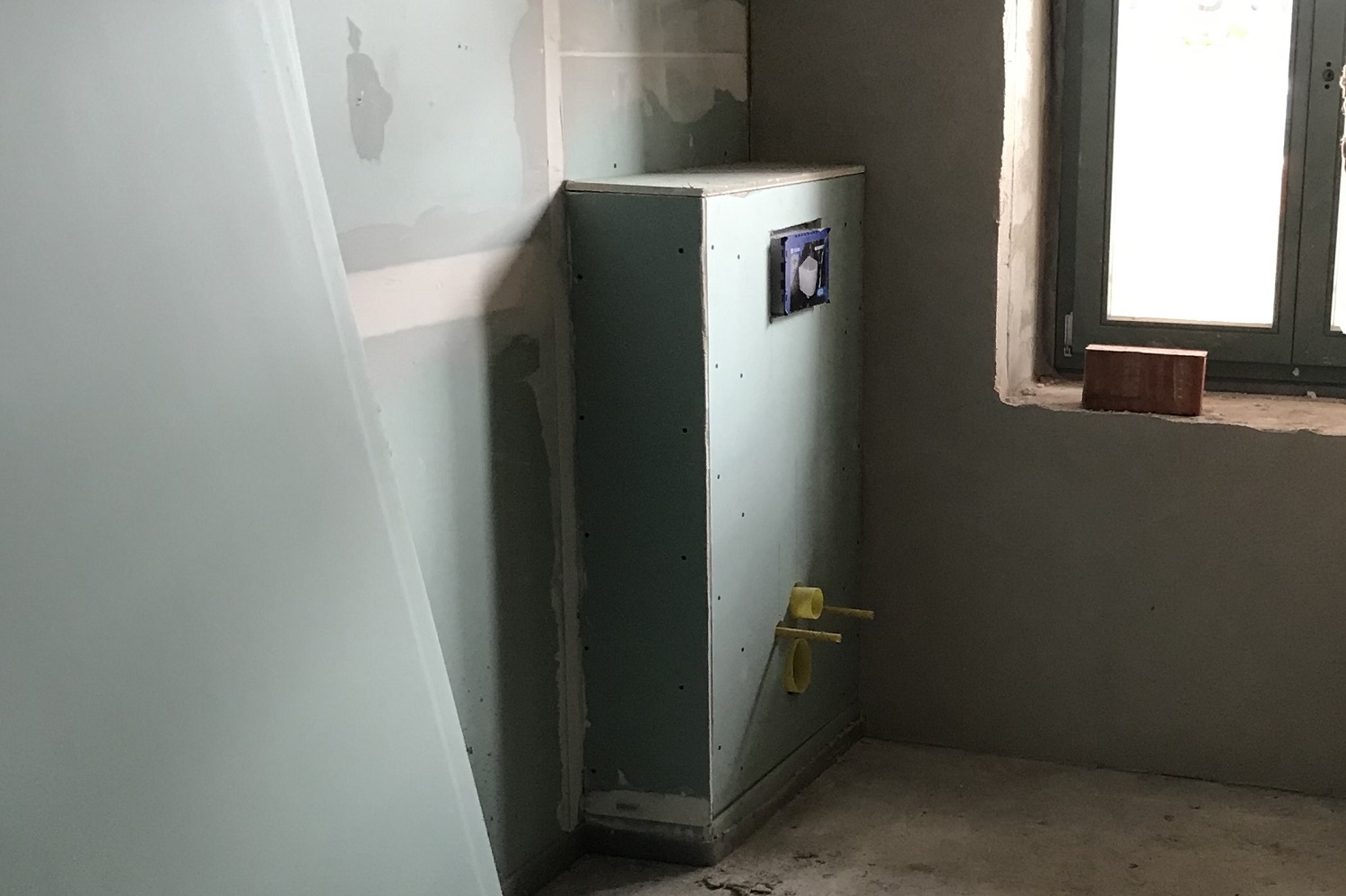 Die Arbeiten in den Wohnungen laufen auf Hochtouren! Die Trockenbauwände wurden gestellt und die Rohinstallationen werden verlegt. Im gleichen Zuge lässt, sich hinter dem Gerüst, bereits die wunderschöne Fassade erahnen, welche ein klassischer Vertreter des Bauens um die Jahrhundertwende zum 20. Jahrhundert ist.