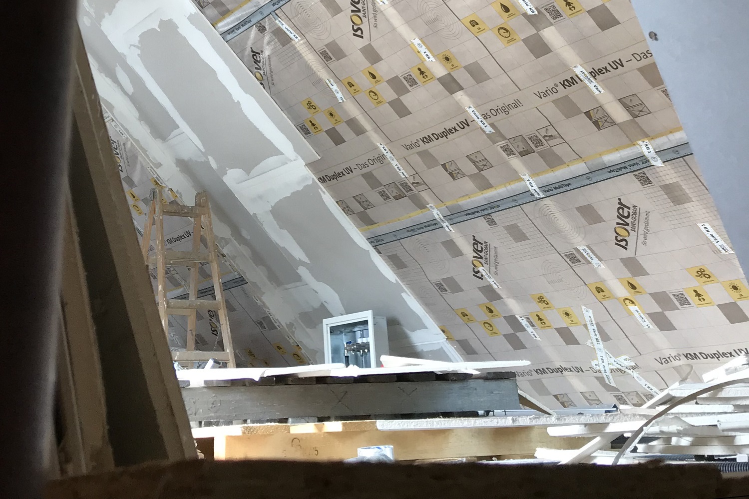 Das Gebäude in der Heinrich-Schütz-Straße 16 ist bis auf den Bereich unterhalb des Hofdurchganges vollständig unterkellert. Damit die vorhandenen Räume, nach der umfangreichen Kernsanierung, als Abstellräume und Hausanschlussräume dienen können, mussten die historischen und massiven Wände und Decken sandgestrahlt werden. Dies dient auch zur Vorbereitung der darauffolgenden, vorschriftsmäßigen Abdichtungsmaßnahmen. Im Zuge der bereits 2018 durchgeführten Sicherungsmaßnahmen wurde bereits das Dach mit Kunstschiefer eingedeckt. Die neue Dachkonstruktion erhielt nun mit den fortführenden Sanierungsarbeiten die Wärmedämmung. Die Trockenbauarbeiten sind bereits vorangeschritten und die Innendämmung wird aufgebracht. Es geht mit großen Schritten voran und in einzelnen Wohnungen lässt sich deren Grundriss schon erkennen.