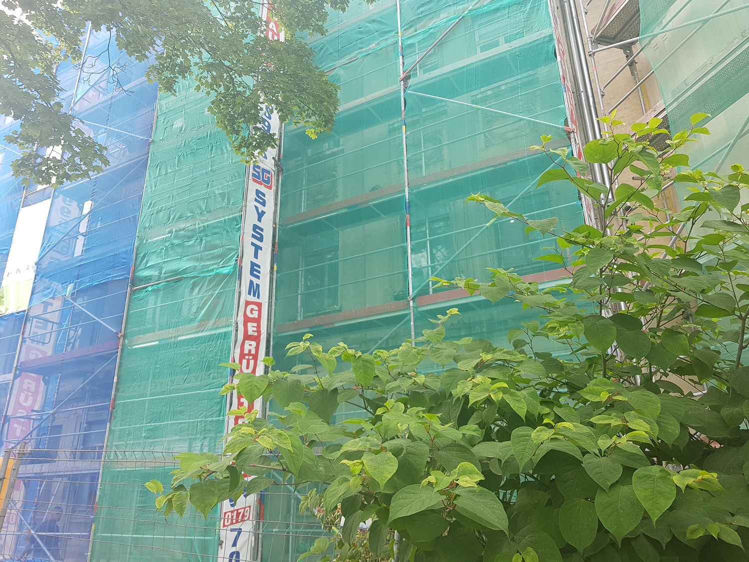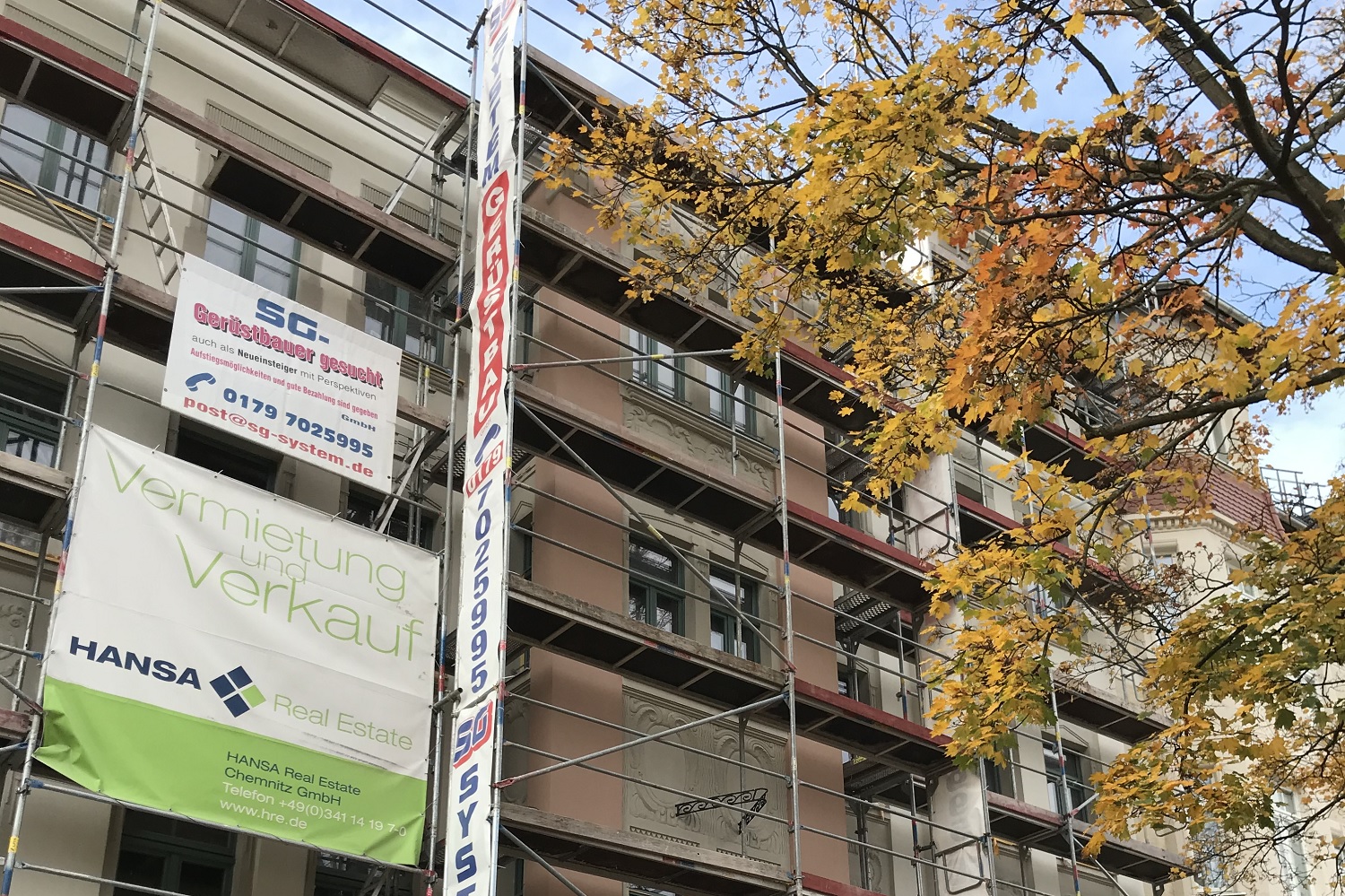 Ein geheimnisvoller Blick auf das Mehrfamilienhaus in der Heinrich-Schütz-Straße 16 - viel zu sehen gibt es nicht mehr, da sich das Mehrfamilienhaus mittlerweile hinter einer Gerüsthülle versteckt. Jedoch gibt es viel zu hören! Es ist laut auf der Baustelle, denn die restlichen Abbrucharbeiten haben begonnen. Doch zuvor mussten im vorhandenen Altbau umfangreiche Bestandsuntersuchungen durchgeführt werden. Dabei wurde angestrebt die geplante Sanierung möglichst stilgerecht und nach Originalbefunden mit den Anforderungen der Statik und sonstiger technischer Bedingungen in Einklang zu bringen.