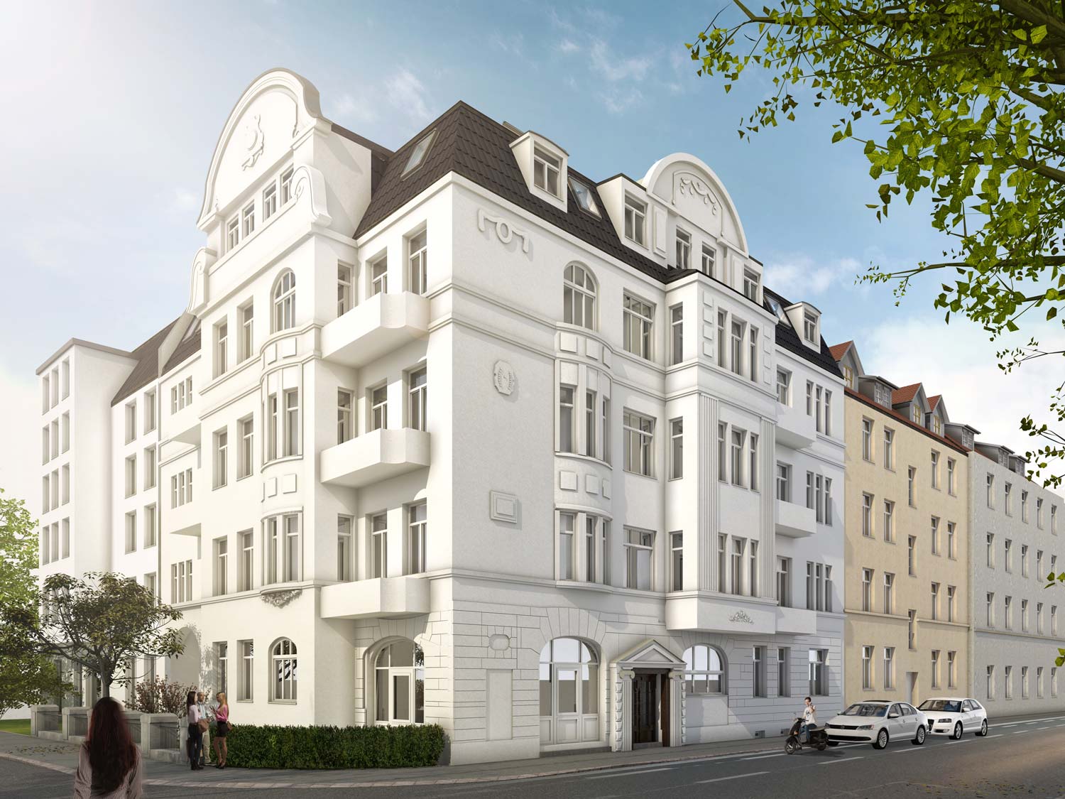 Durch die umfassende Kernsanierung soll das repräsentative und wunderschöne Eckgebäude nach denkmalrechtlichen Vorgaben in neuem Glanz erstrahlen. Mit Fertigstellung entstehen insgesamt 15 komfortable Eigentumswohnungen mit Größen zwischen ca. 55,00 m² und 151,00 m².