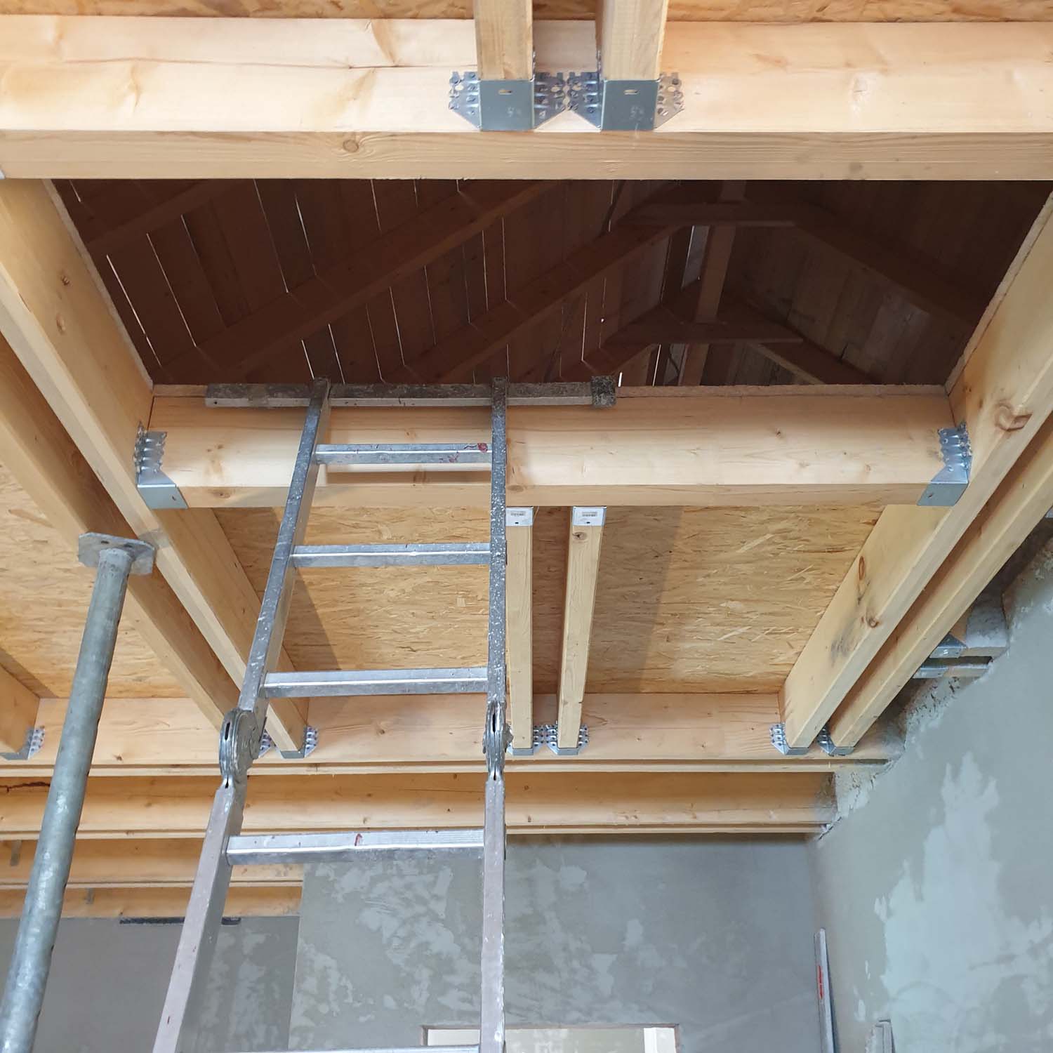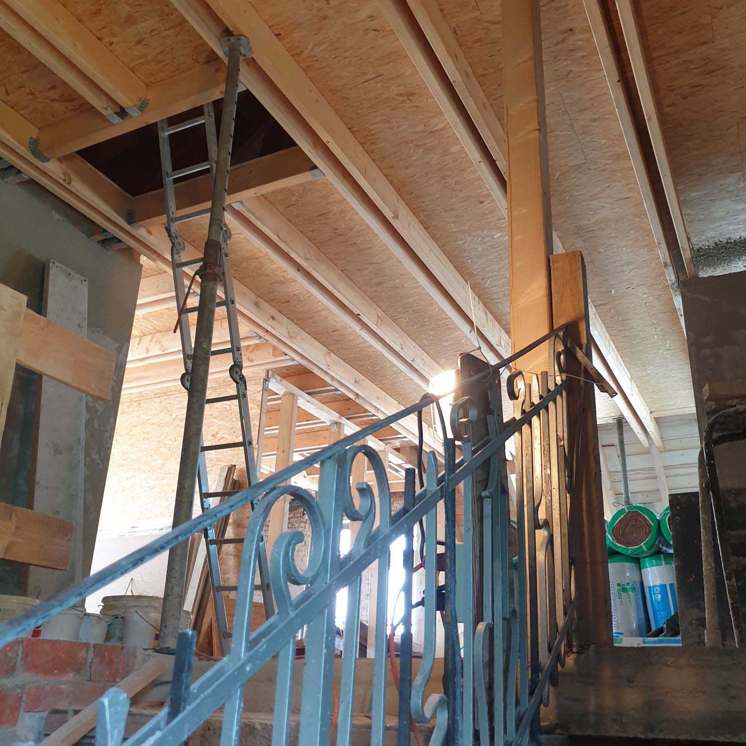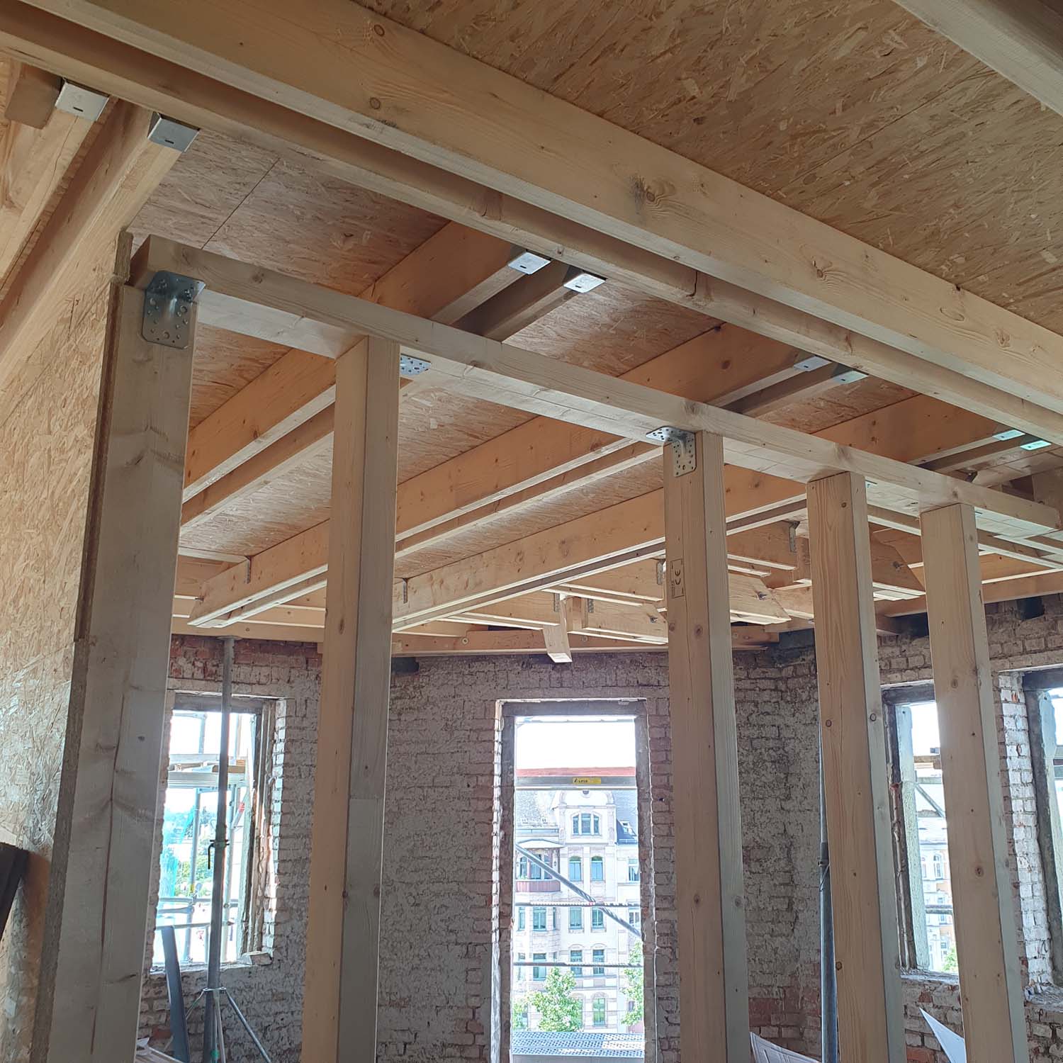Nach einer Bauunterbrechung, welche aufgrund von Straßenbauarbeiten (direkt vor dem Objekt) eingetreten ist, können die Arbeiten am Objekt nun wieder in voller Kraft ausgeführt werden. Nachdem die ersten Decken freigelegt wurden, werden diese nun in Abstimmung mit dem Holzschutzgutachter saniert.