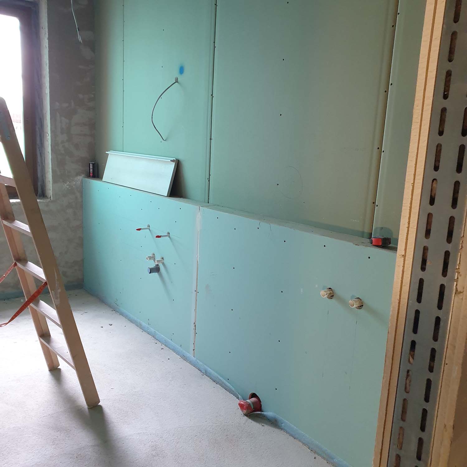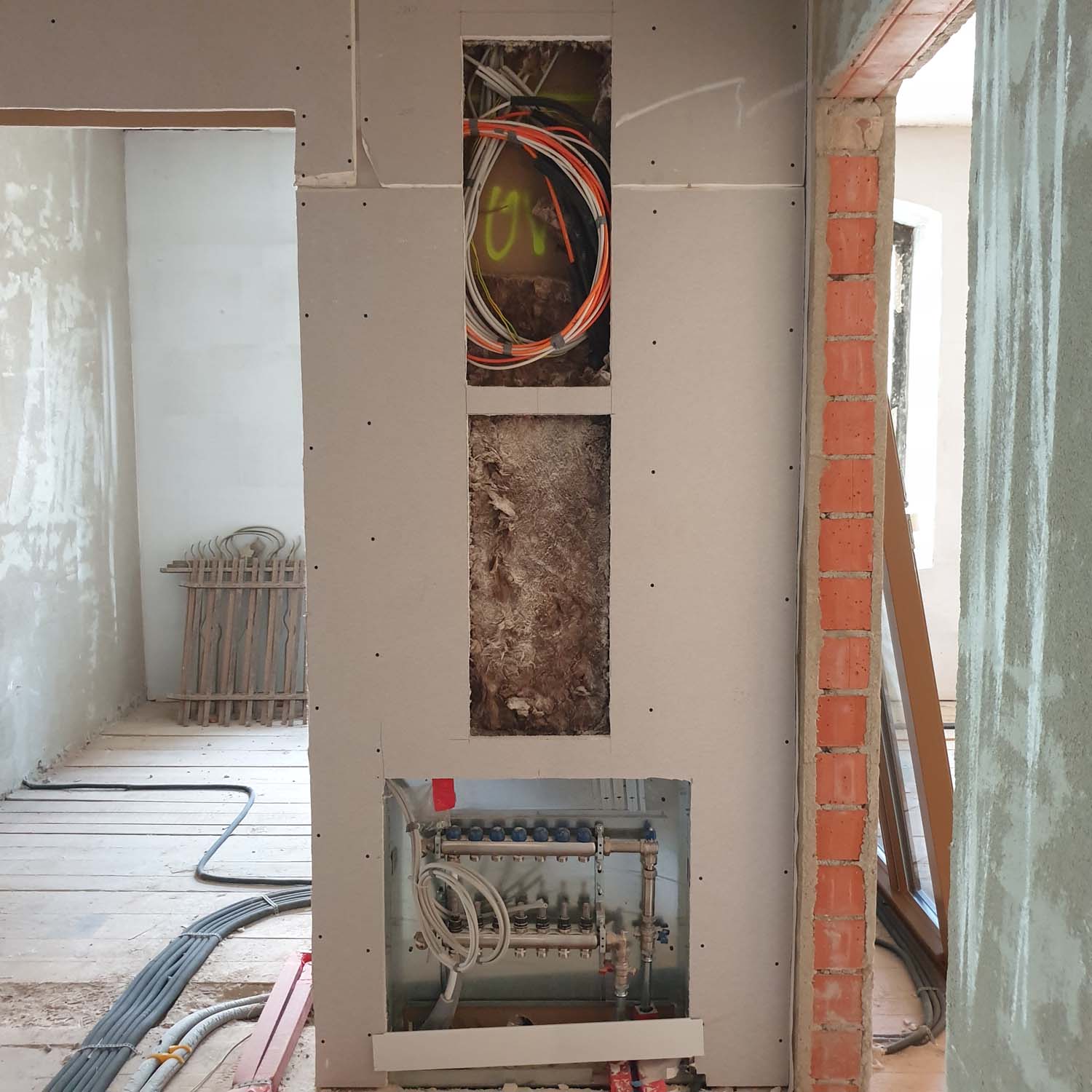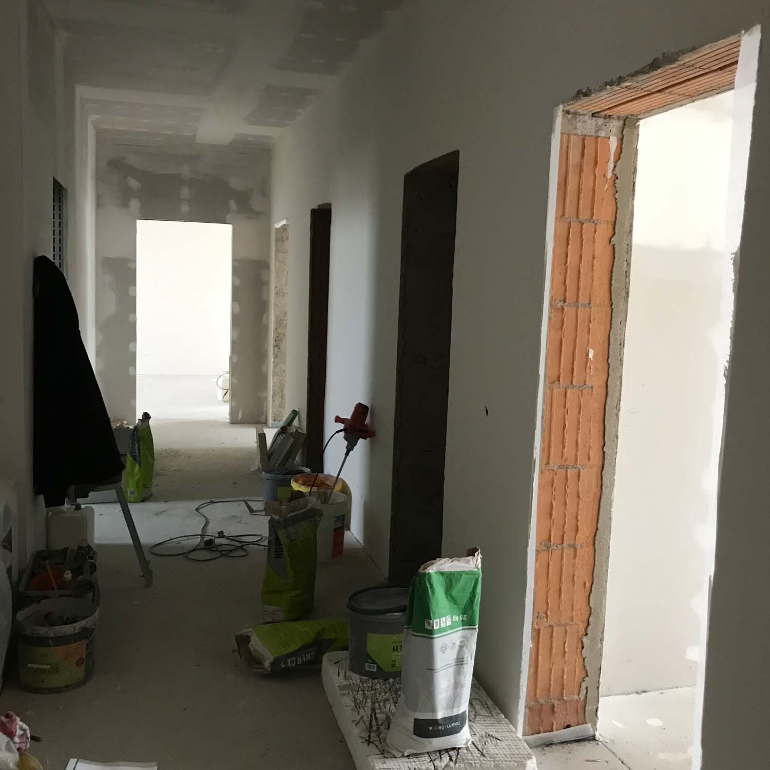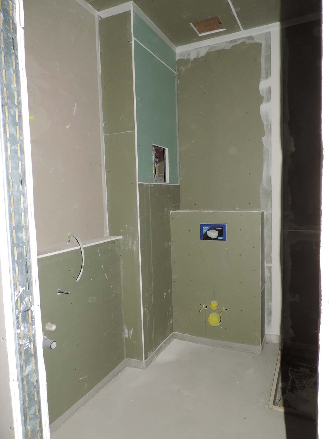 In unserem Eckgebäude gehen inzwischen die Estricharbeiten gut voran. In vielen Wohnungen sind diese bereits abgeschlossen und in den verbleibenden Wohnungen wurden die Arbeiten bereits vorbereitet. In den Wohnräumen wurden die Innenfensterbänke eingebaut und in den Bädern sind die Handwerker dabei die Installationswände zu schließen, so dass in Kürze bereits mit den Maler- und Fliesenarbeiten begonnen werden kann.