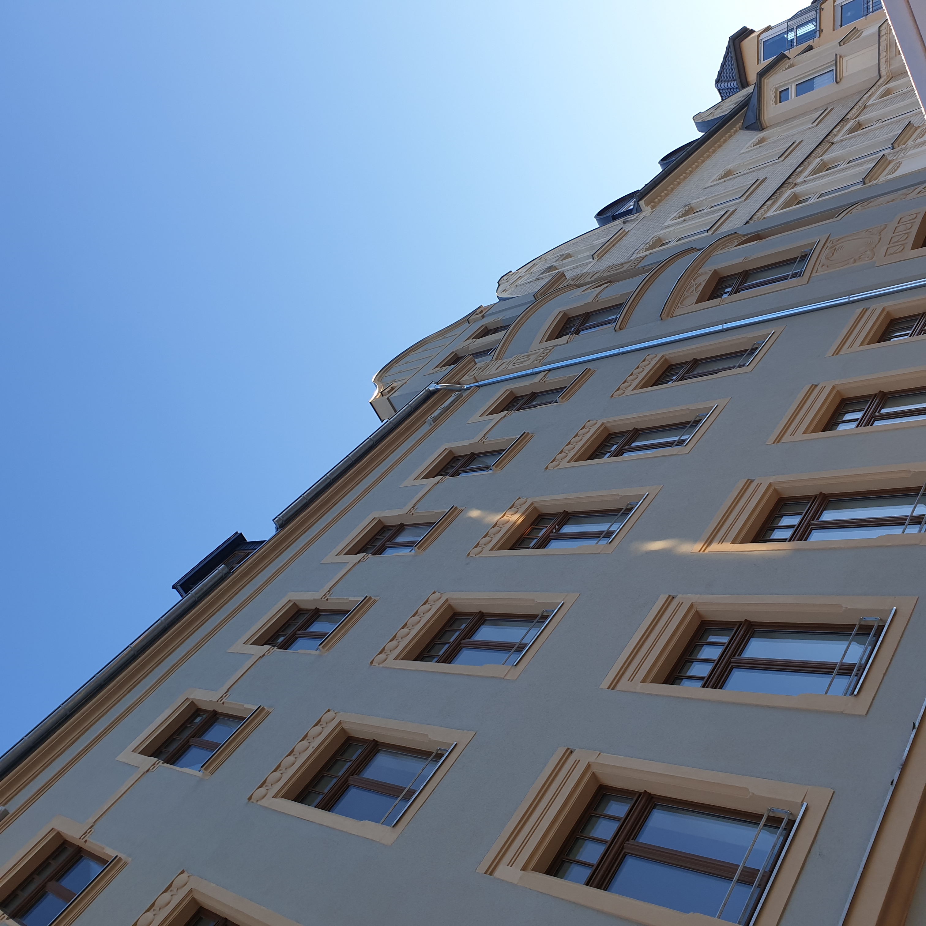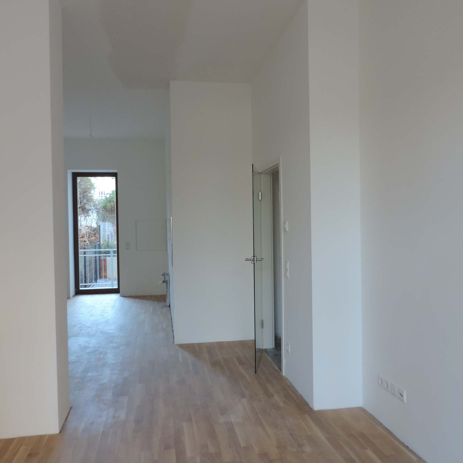 Auf Seiten der Stadlerstraße kann man bereits seit Mitte November die schöne neue Fassade des Eckhauses begutachten und auch der Rest der straßenseitigen Fassade wird zu Ende November abgerüstet werden. Im Inneren des Hauses sind die Fliesenarbeiten in den Normalgeschossen weitgehend abgeschlossen und die Malerarbeiten in den letzten Zügen. In vielen Bädern sind bereits die Sanitärkeramiken montiert und in den übrigen Zimmern wird fortlaufend Parkett verlegt. Lediglich die Wohnungs- und Innentüren lassen aufgrund der leider erneut zugespitzten Corona-Situation bezüglich der Lieferung und Montage auf sich warten. Im Dachgeschoss kam es coronabedingt ebenfalls leider zu Verzögerungen, weswegen erst jetzt in den nächsten Tagen auch dort der Estrich verlegt wird.