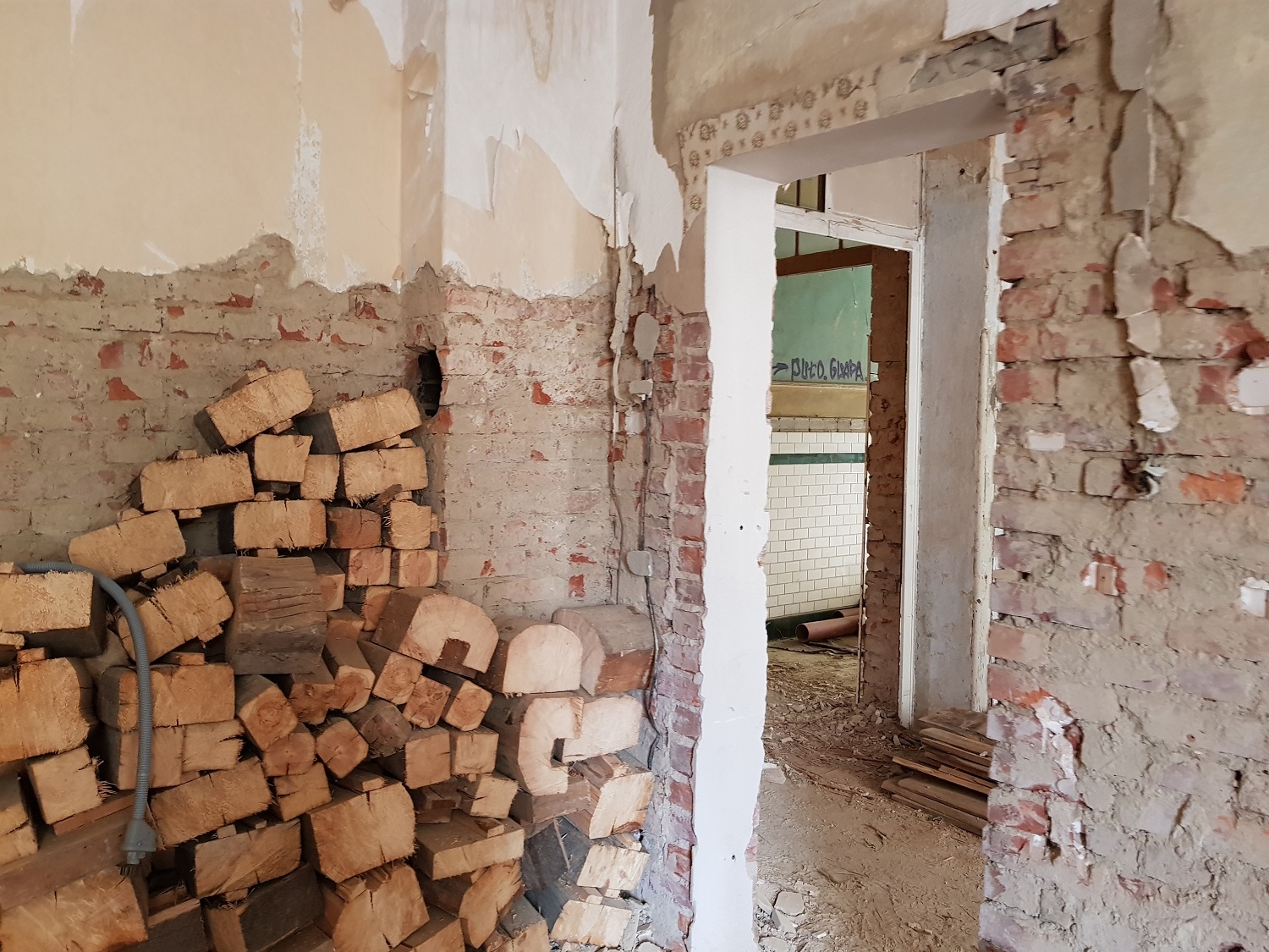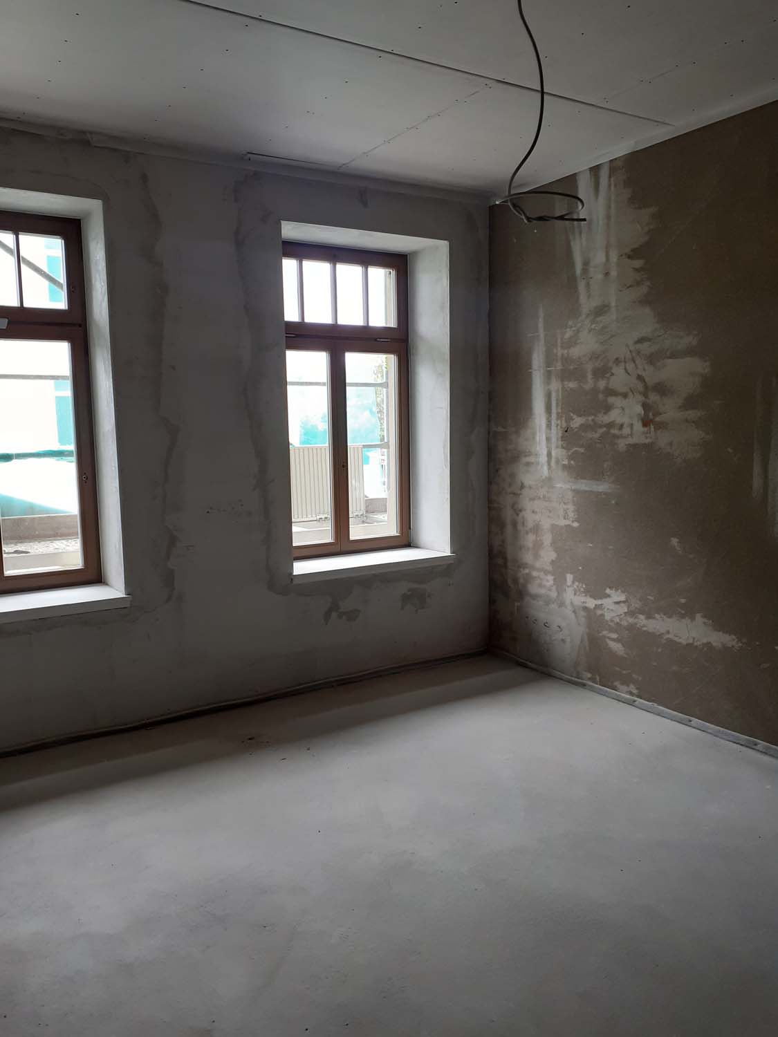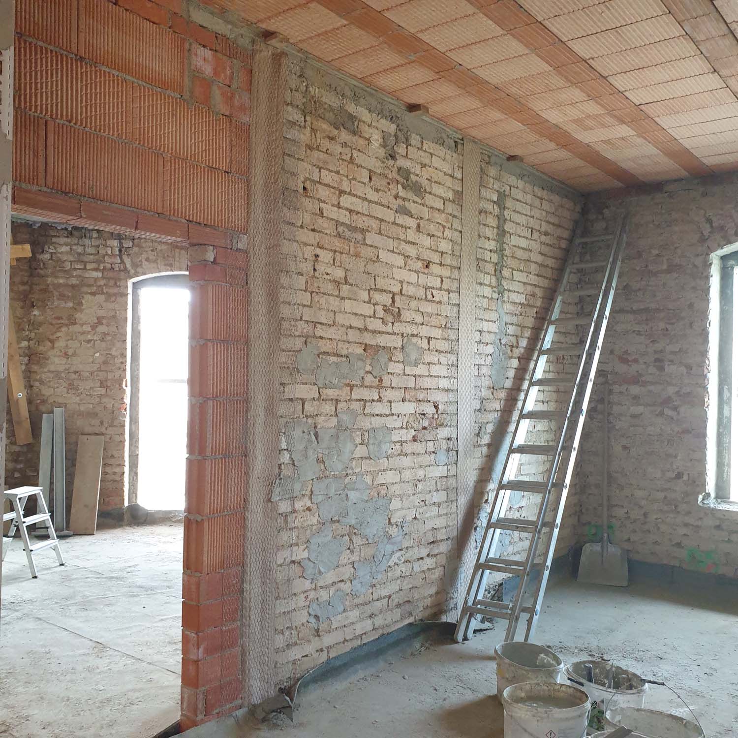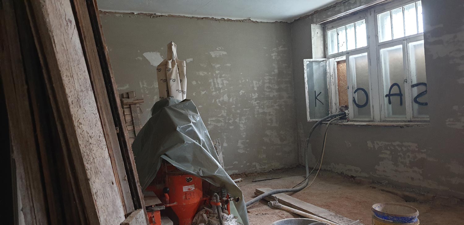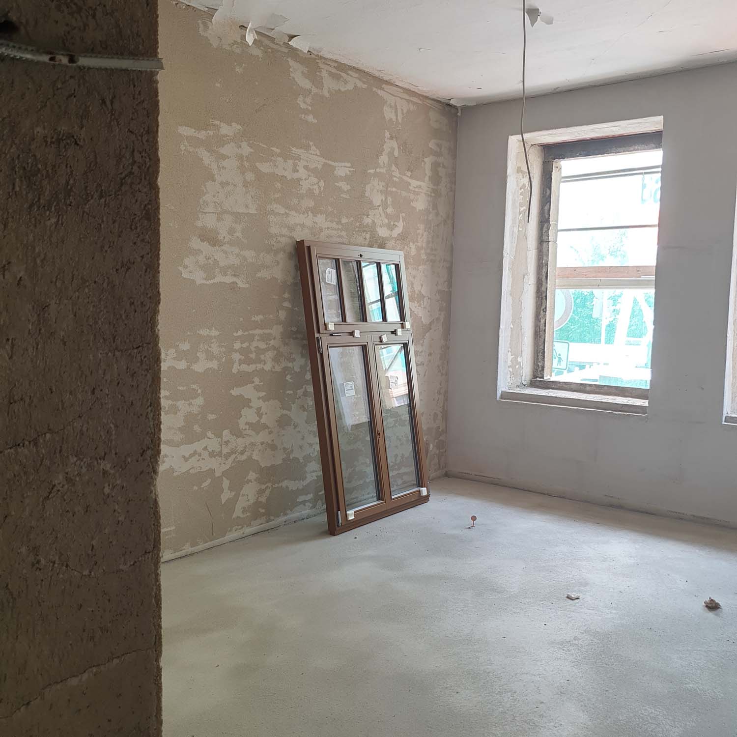 Die Entkernung des Objektes konnte in diesem Monat abgeschlossen werden und auch die Deckenbalkensanierung ist fast beendet. Auf der Baustelle wurde daher nun mit den Rohbauarbeiten begonnen. Dazu wurden sowohl in den Wohnungen als auch im Treppenhaus künftig nicht mehr benötigte Öffnungen verschlossen und Fensterbrüstungen erneuert. Im Erdgeschoss haben die Handwerker bereits mit den Innenputzarbeiten begonnen.
