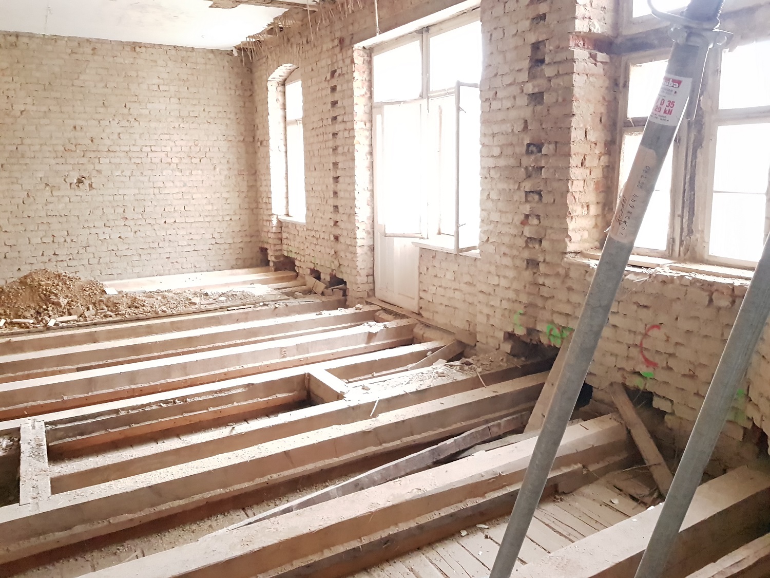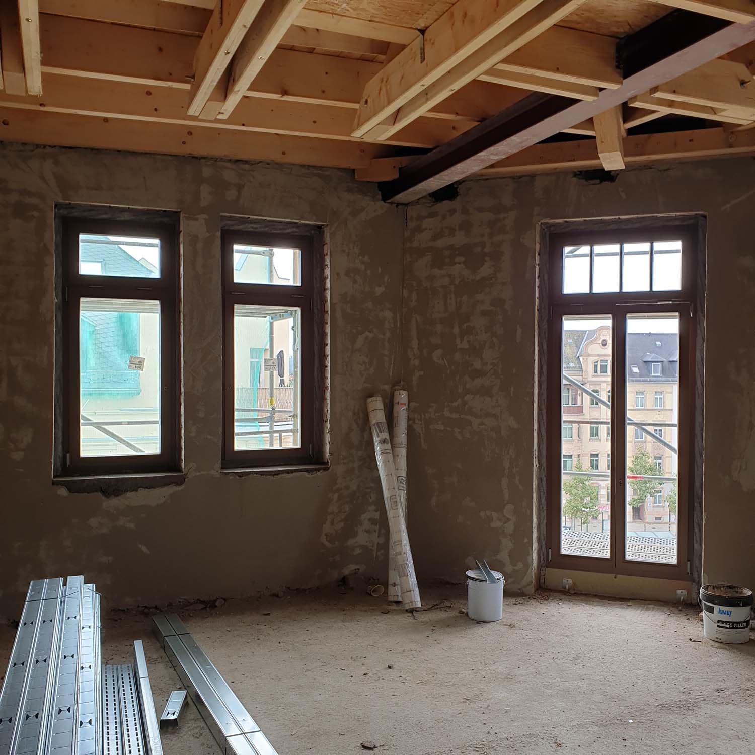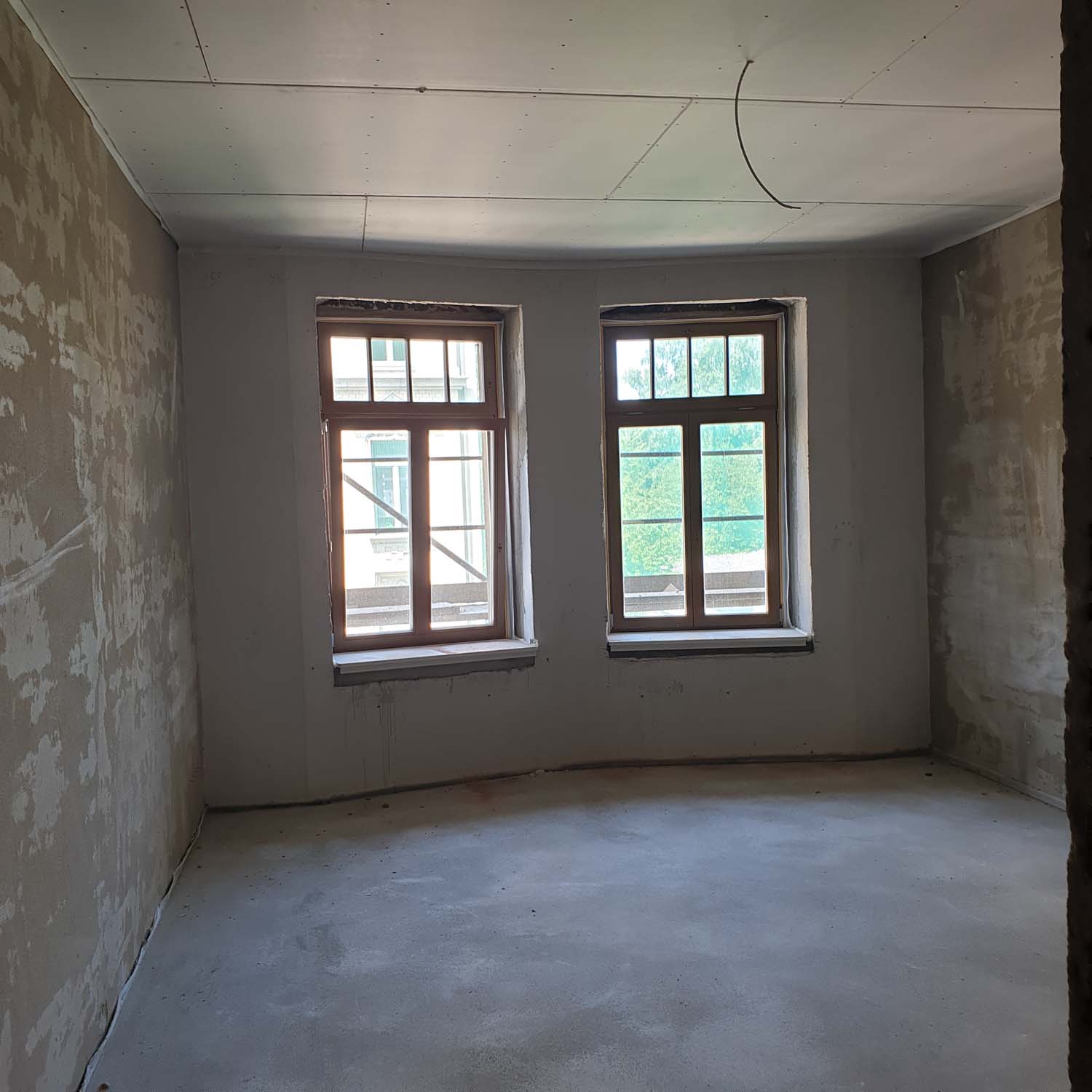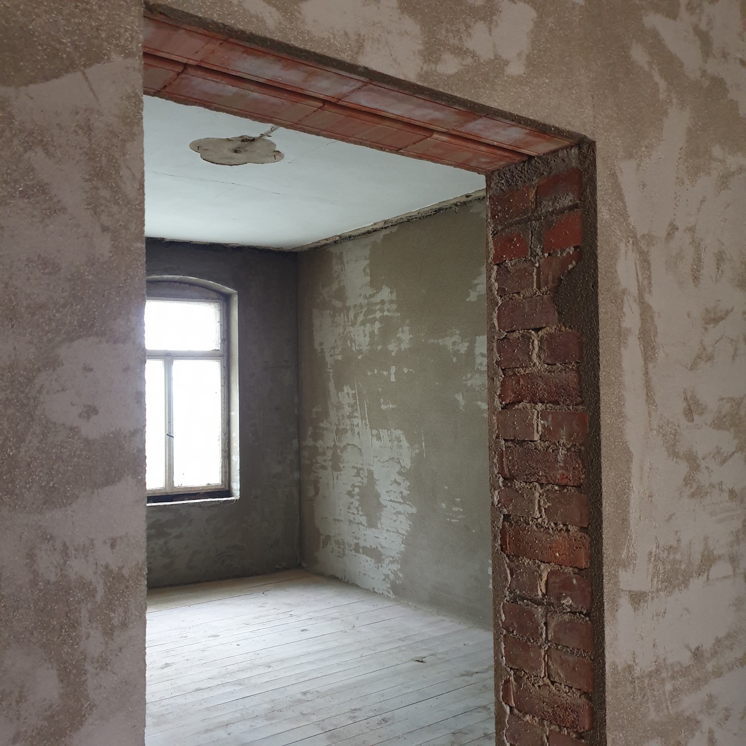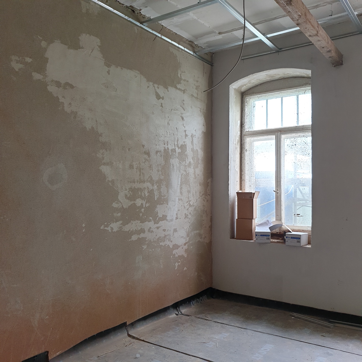 Die Entkernung des Objektes konnte in diesem Monat abgeschlossen werden und auch die Deckenbalkensanierung ist fast beendet. Auf der Baustelle wurde daher nun mit den Rohbauarbeiten begonnen. Dazu wurden sowohl in den Wohnungen als auch im Treppenhaus künftig nicht mehr benötigte Öffnungen verschlossen und Fensterbrüstungen erneuert. Im Erdgeschoss haben die Handwerker bereits mit den Innenputzarbeiten begonnen.