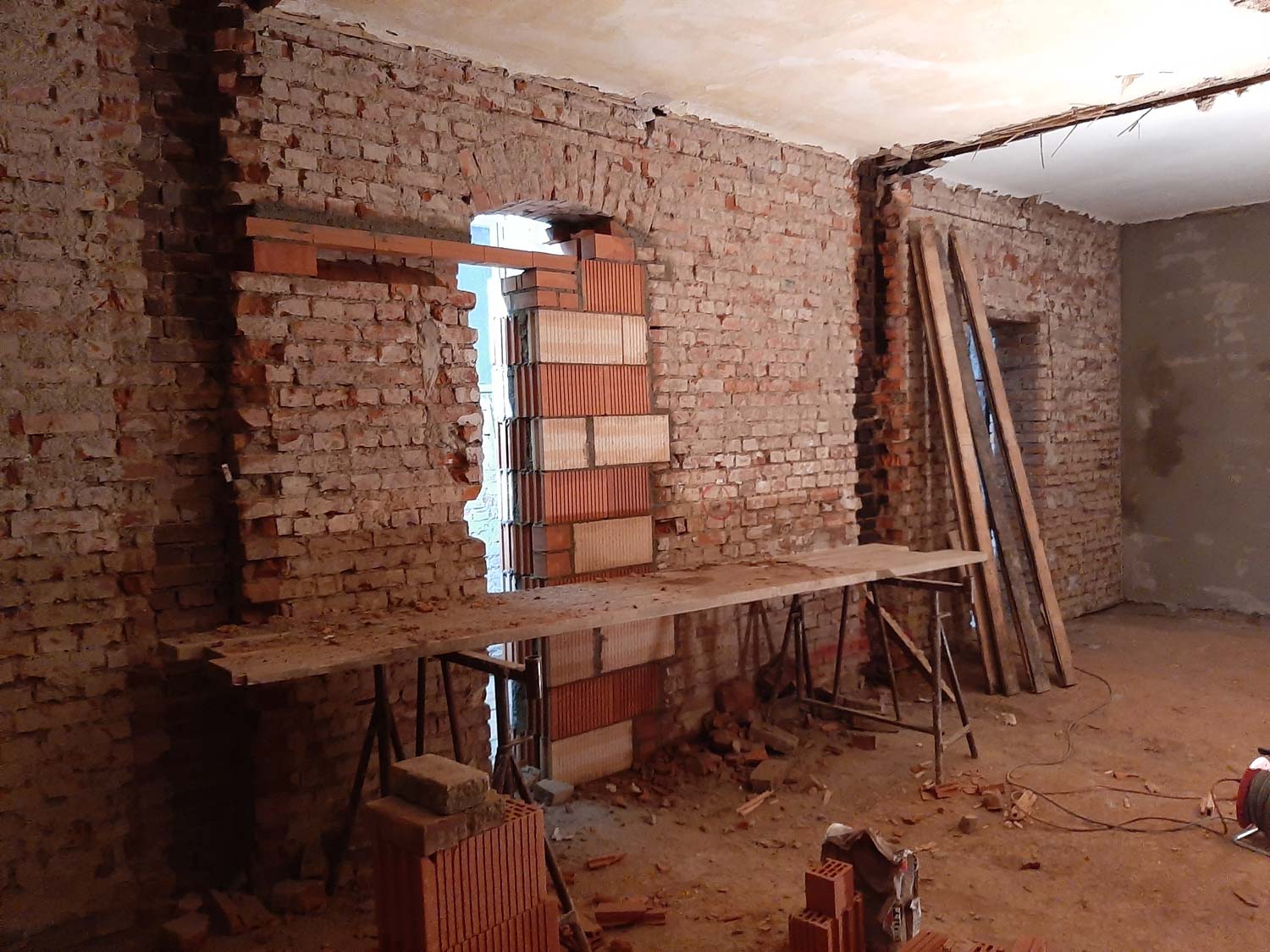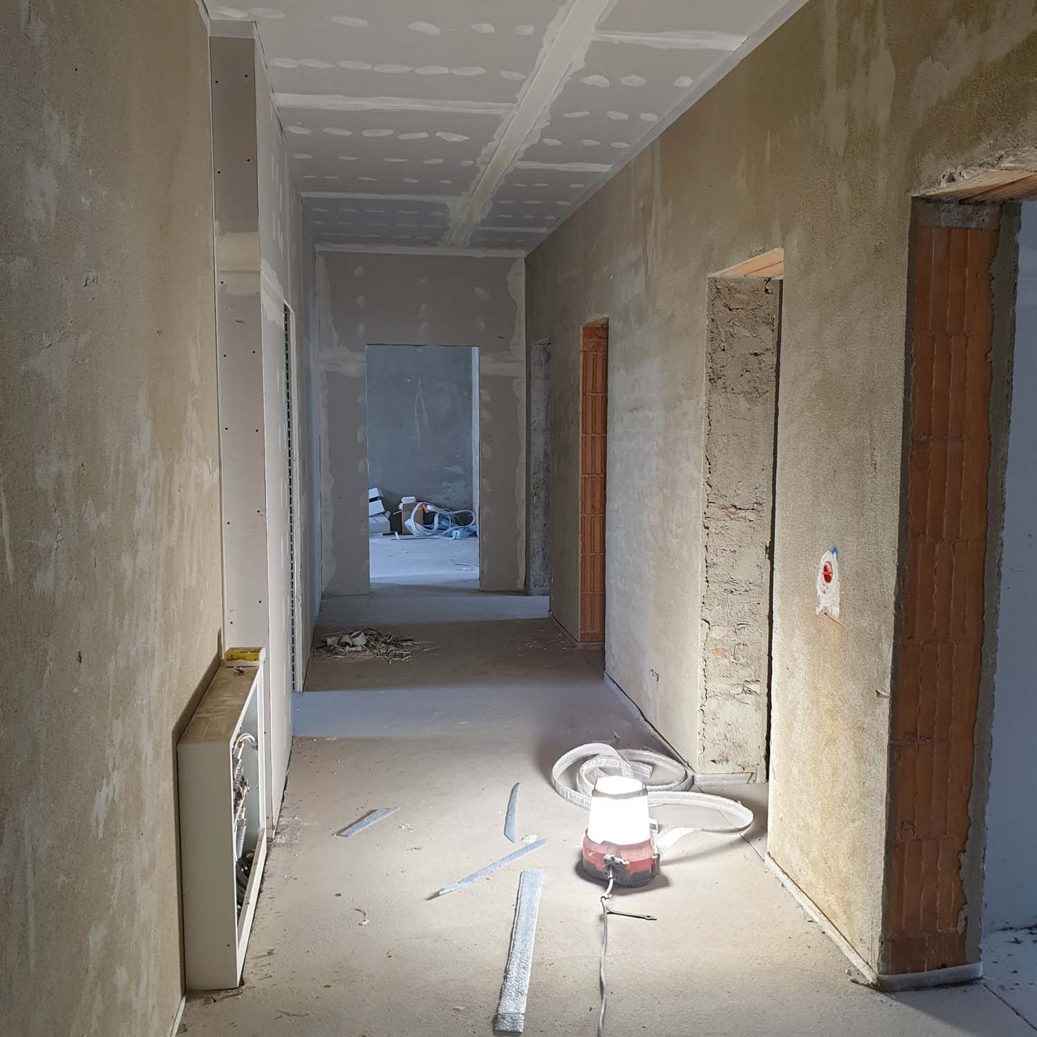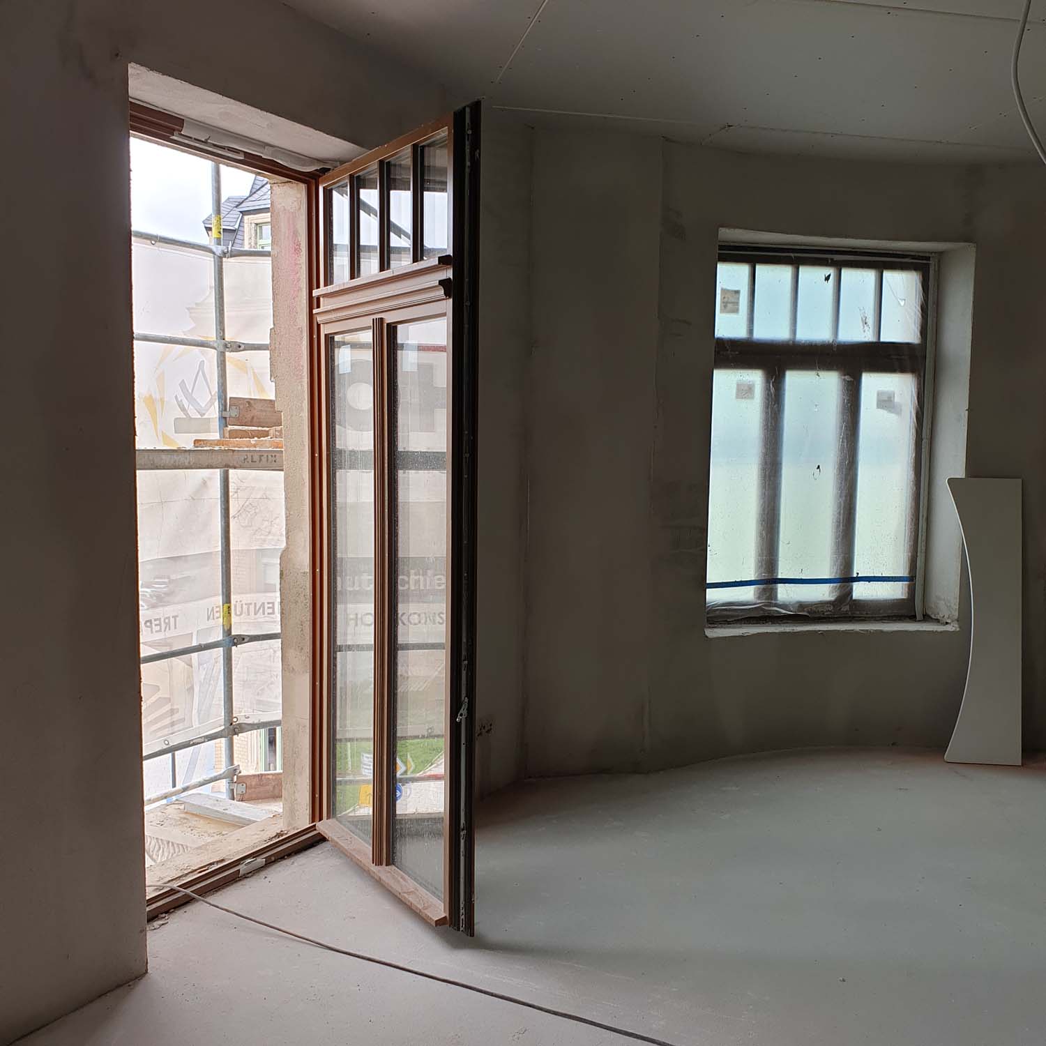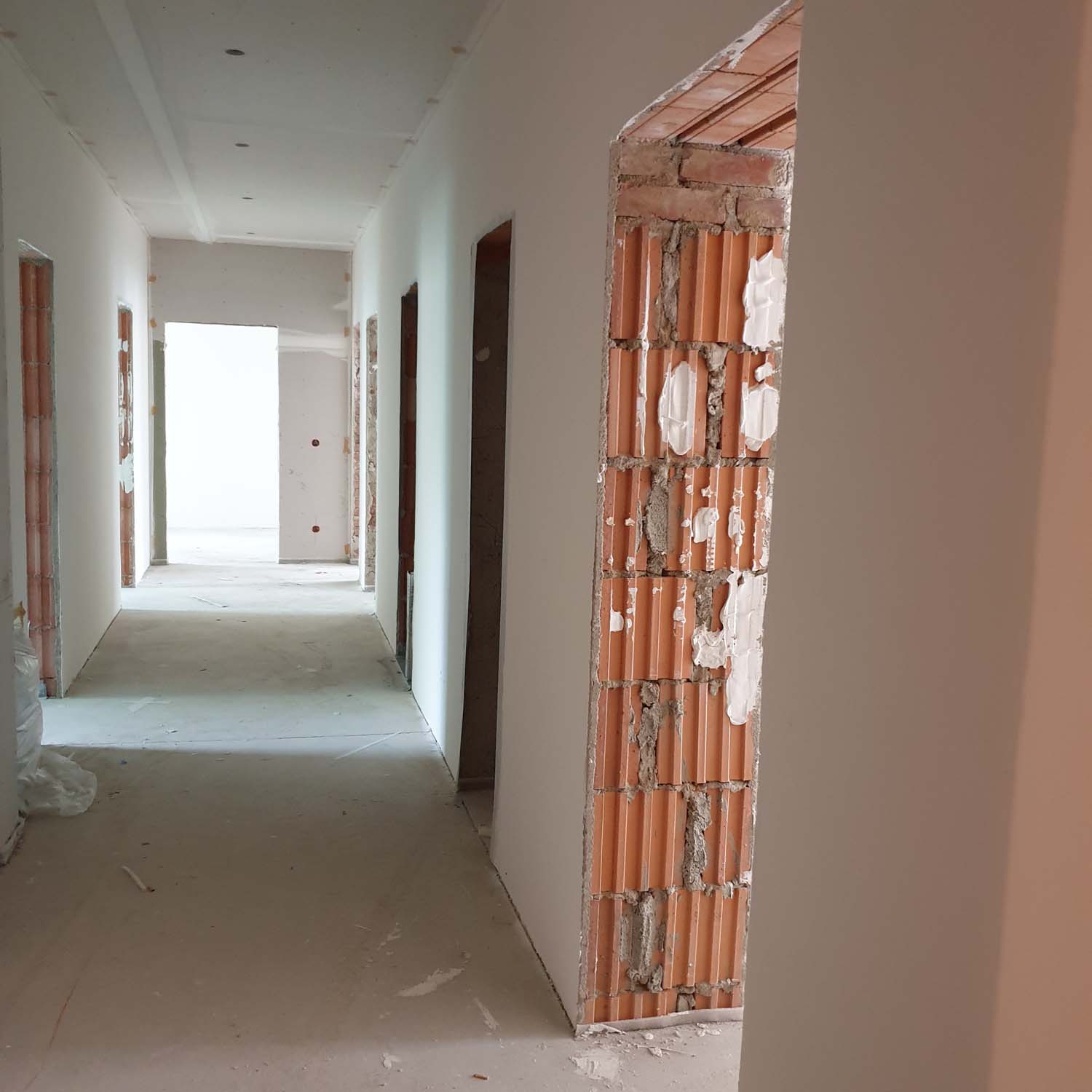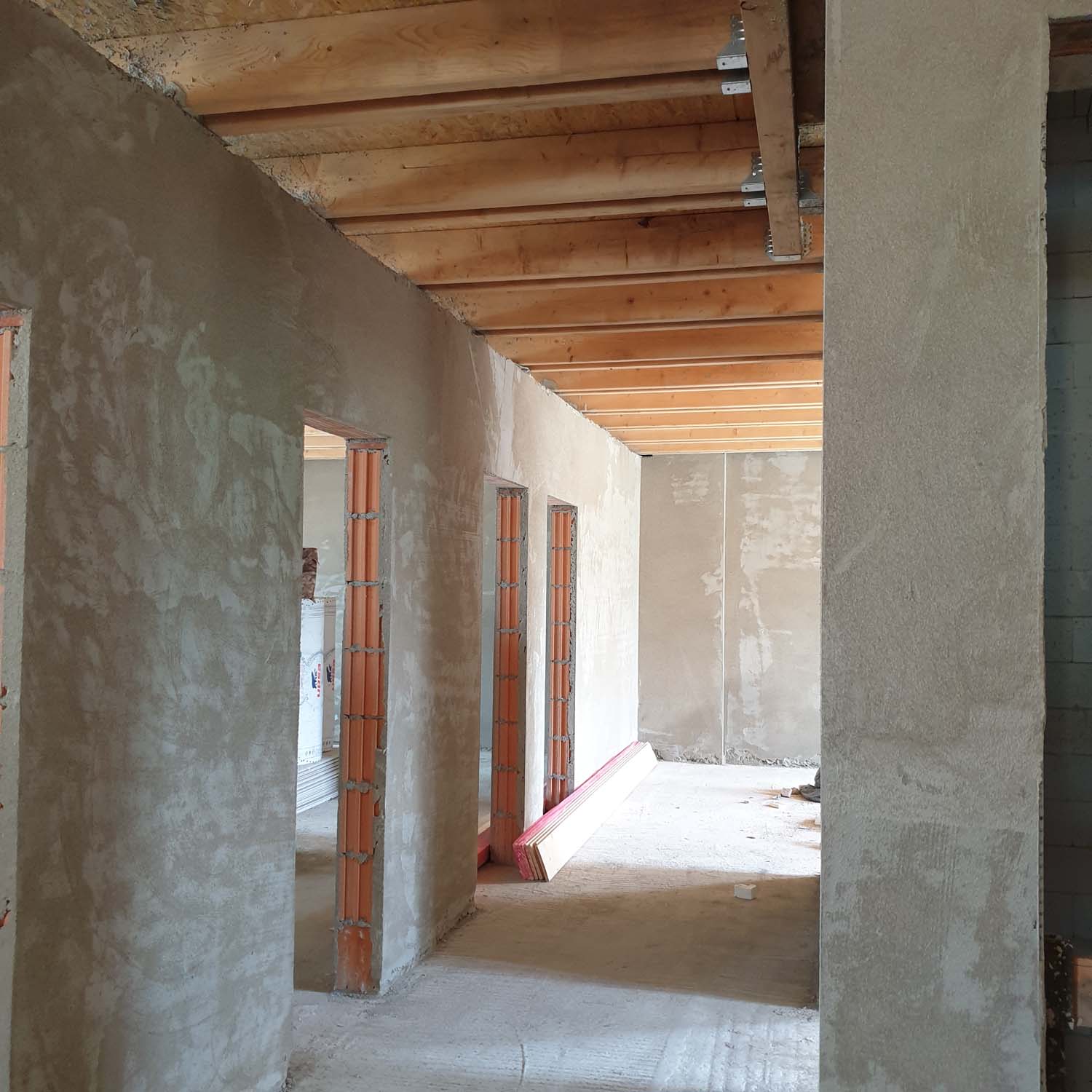Die Entkernung des Objektes konnte in diesem Monat abgeschlossen werden und auch die Deckenbalkensanierung ist fast beendet. Auf der Baustelle wurde daher nun mit den Rohbauarbeiten begonnen. Dazu wurden sowohl in den Wohnungen als auch im Treppenhaus künftig nicht mehr benötigte Öffnungen verschlossen und Fensterbrüstungen erneuert. Im Erdgeschoss haben die Handwerker bereits mit den Innenputzarbeiten begonnen.
