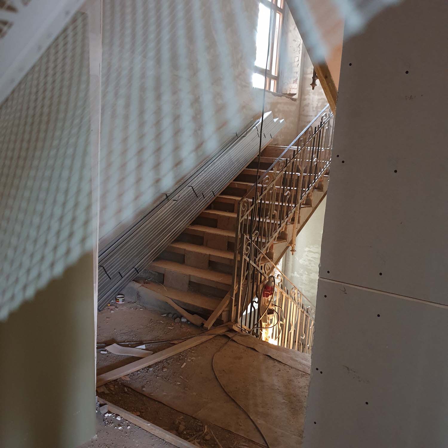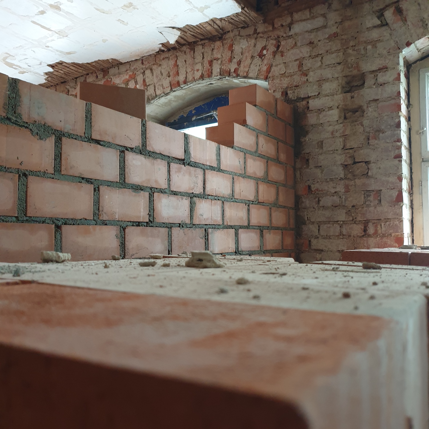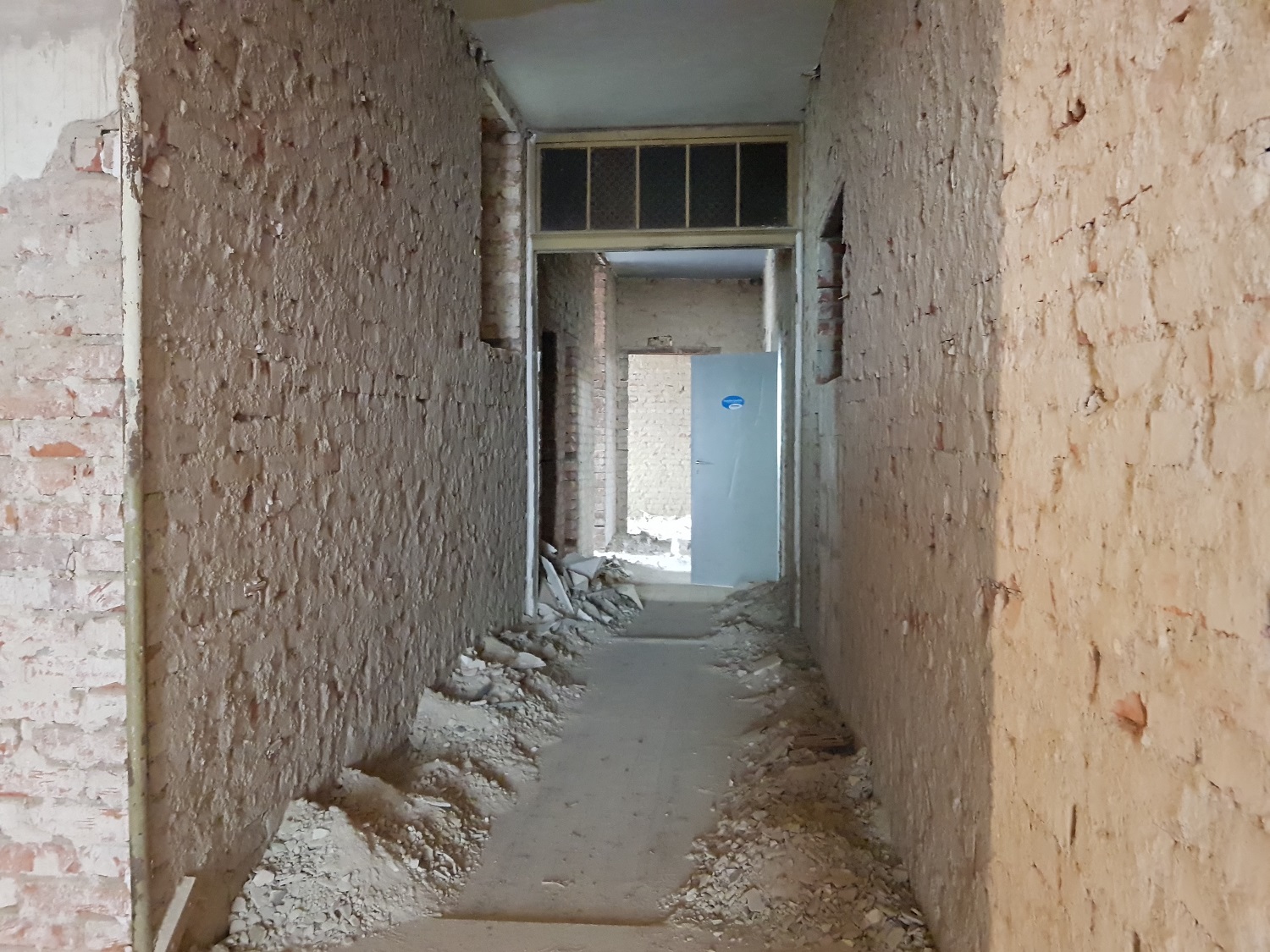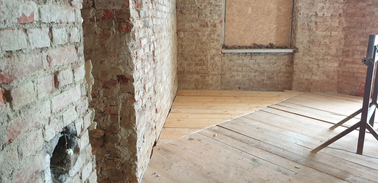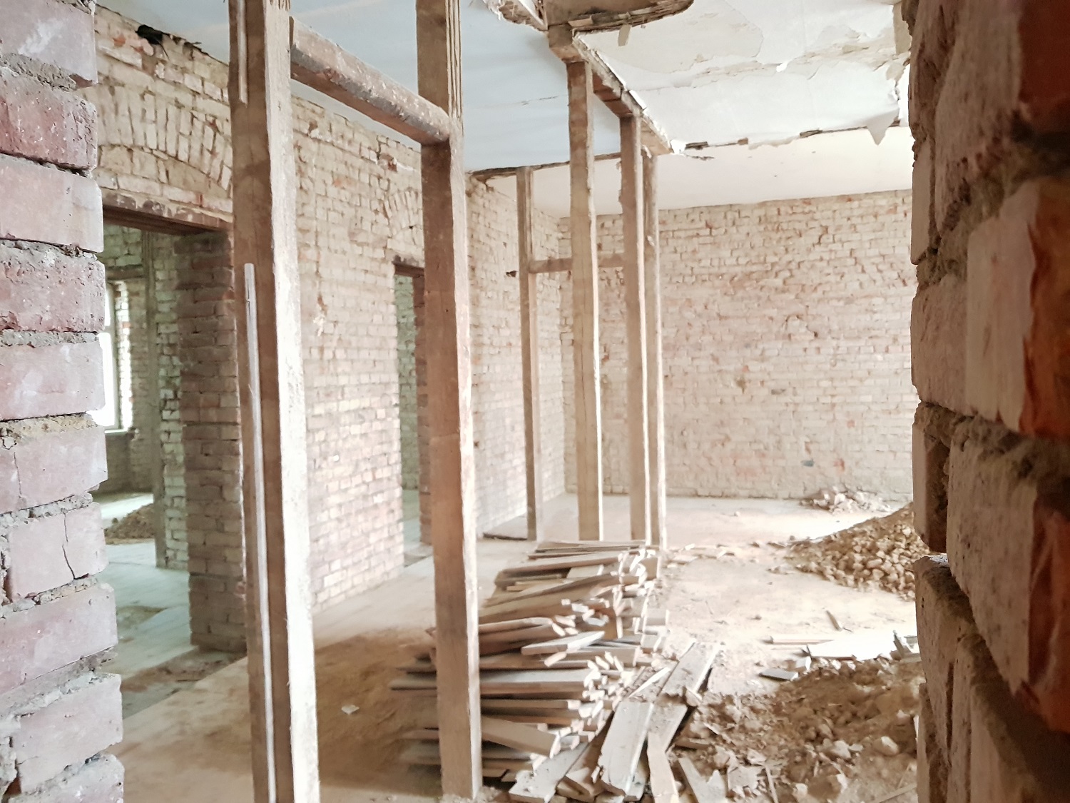 Die Entkernung des Objektes konnte in diesem Monat abgeschlossen werden und auch die Deckenbalkensanierung ist fast beendet. Auf der Baustelle wurde daher nun mit den Rohbauarbeiten begonnen. Dazu wurden sowohl in den Wohnungen als auch im Treppenhaus künftig nicht mehr benötigte Öffnungen verschlossen und Fensterbrüstungen erneuert. Im Erdgeschoss haben die Handwerker bereits mit den Innenputzarbeiten begonnen.