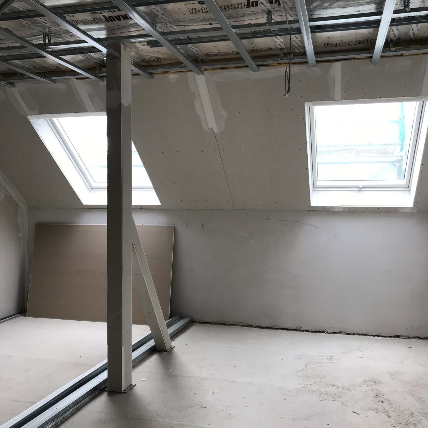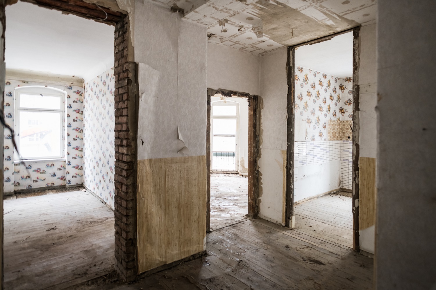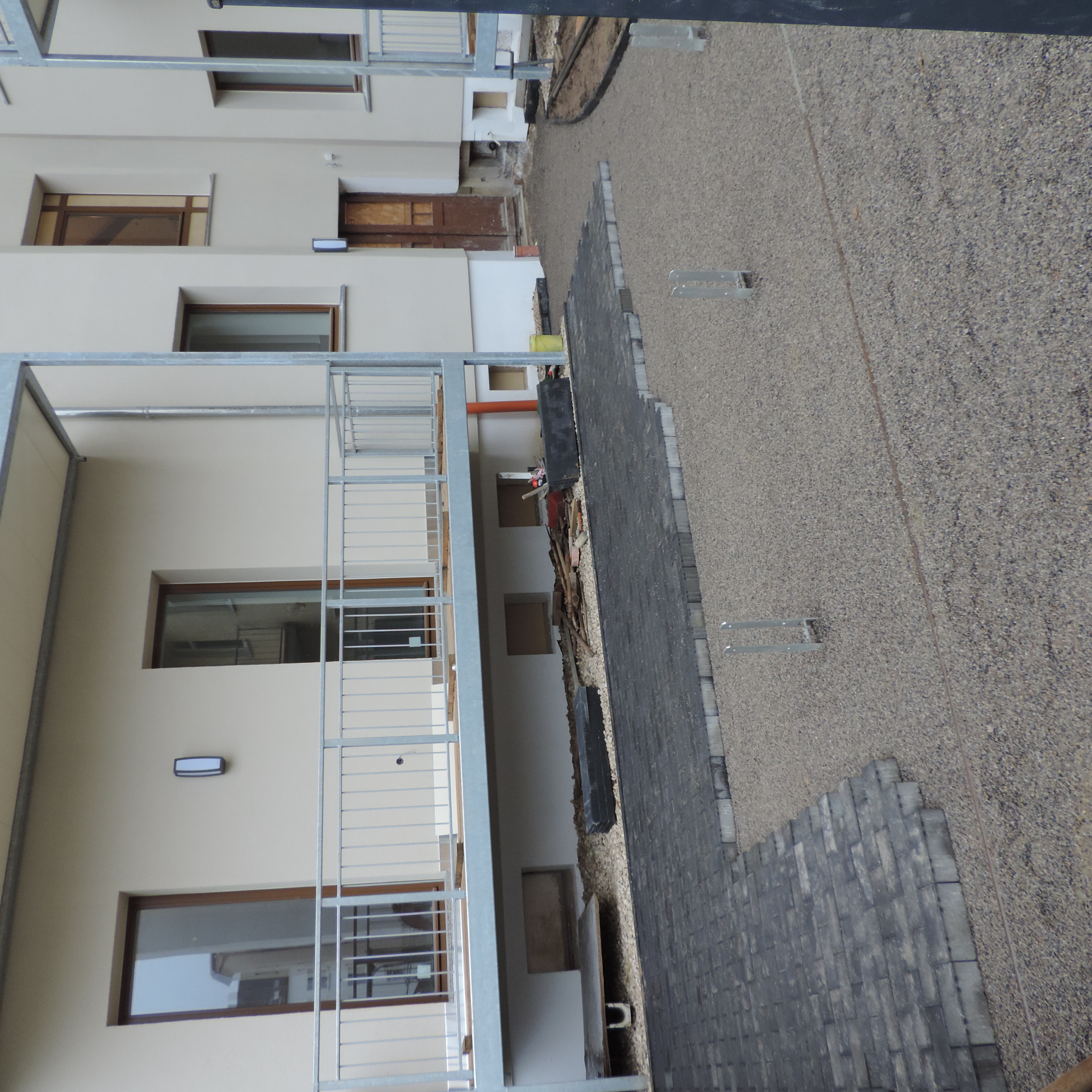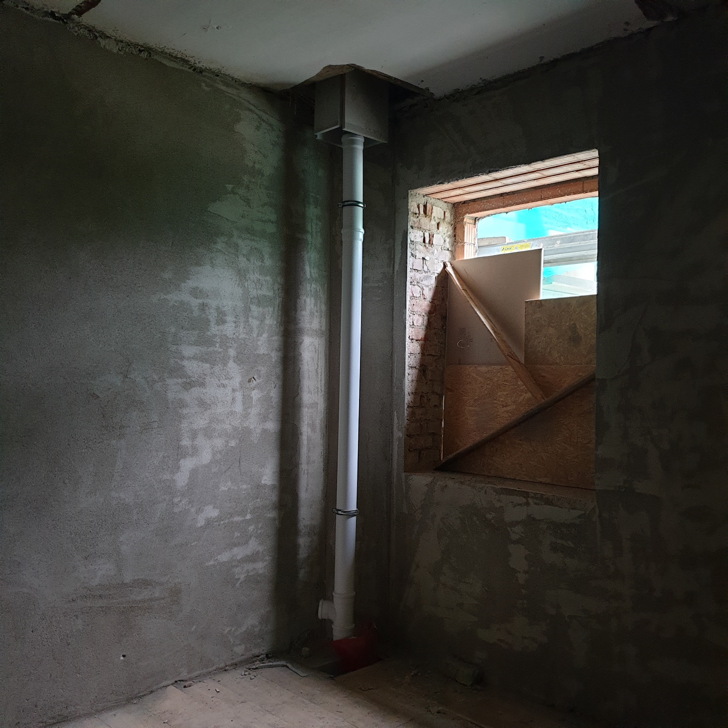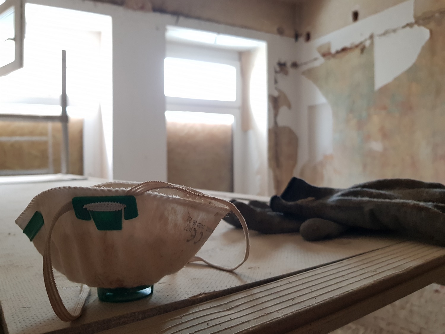 Die Entkernung des Objektes konnte in diesem Monat abgeschlossen werden und auch die Deckenbalkensanierung ist fast beendet. Auf der Baustelle wurde daher nun mit den Rohbauarbeiten begonnen. Dazu wurden sowohl in den Wohnungen als auch im Treppenhaus künftig nicht mehr benötigte Öffnungen verschlossen und Fensterbrüstungen erneuert. Im Erdgeschoss haben die Handwerker bereits mit den Innenputzarbeiten begonnen.
