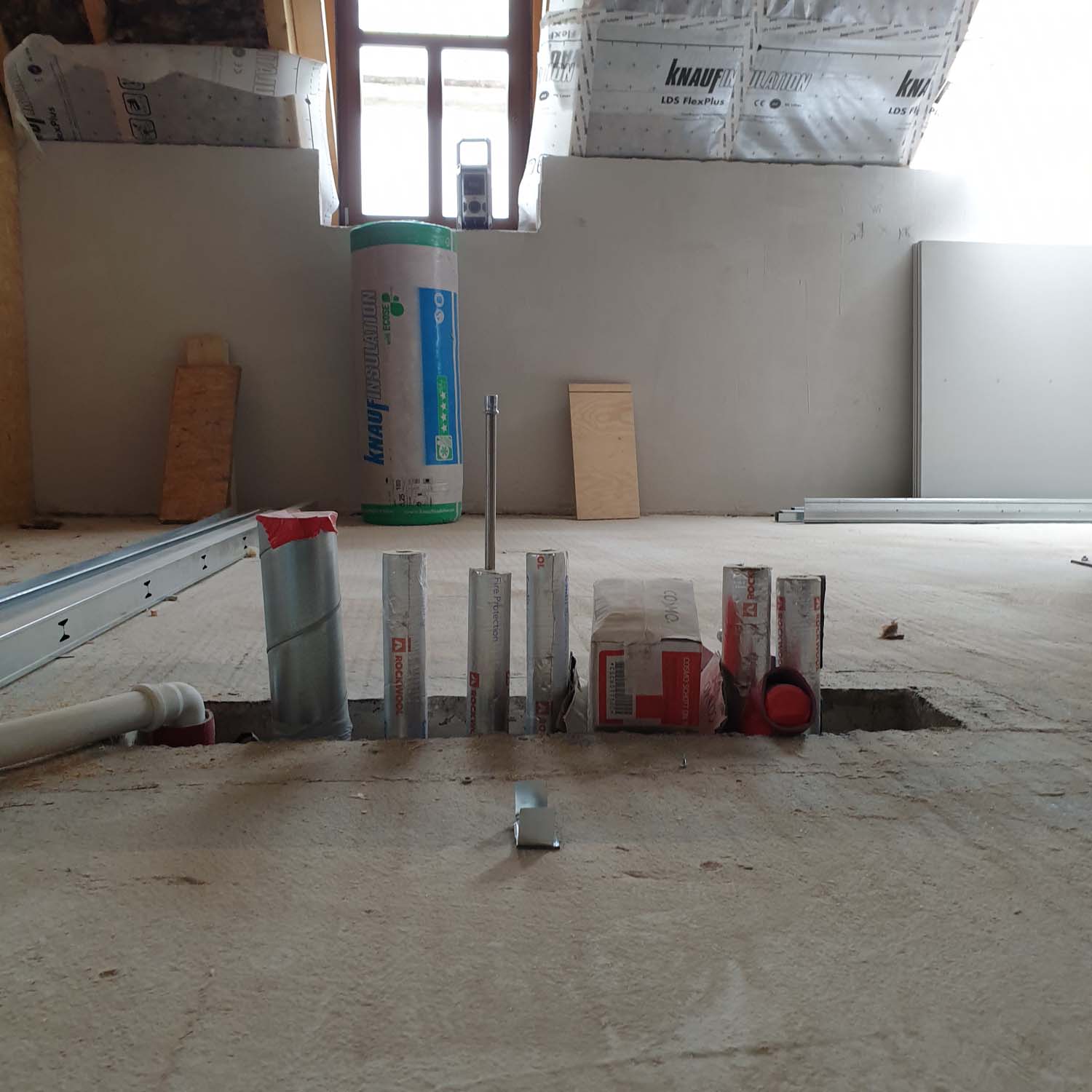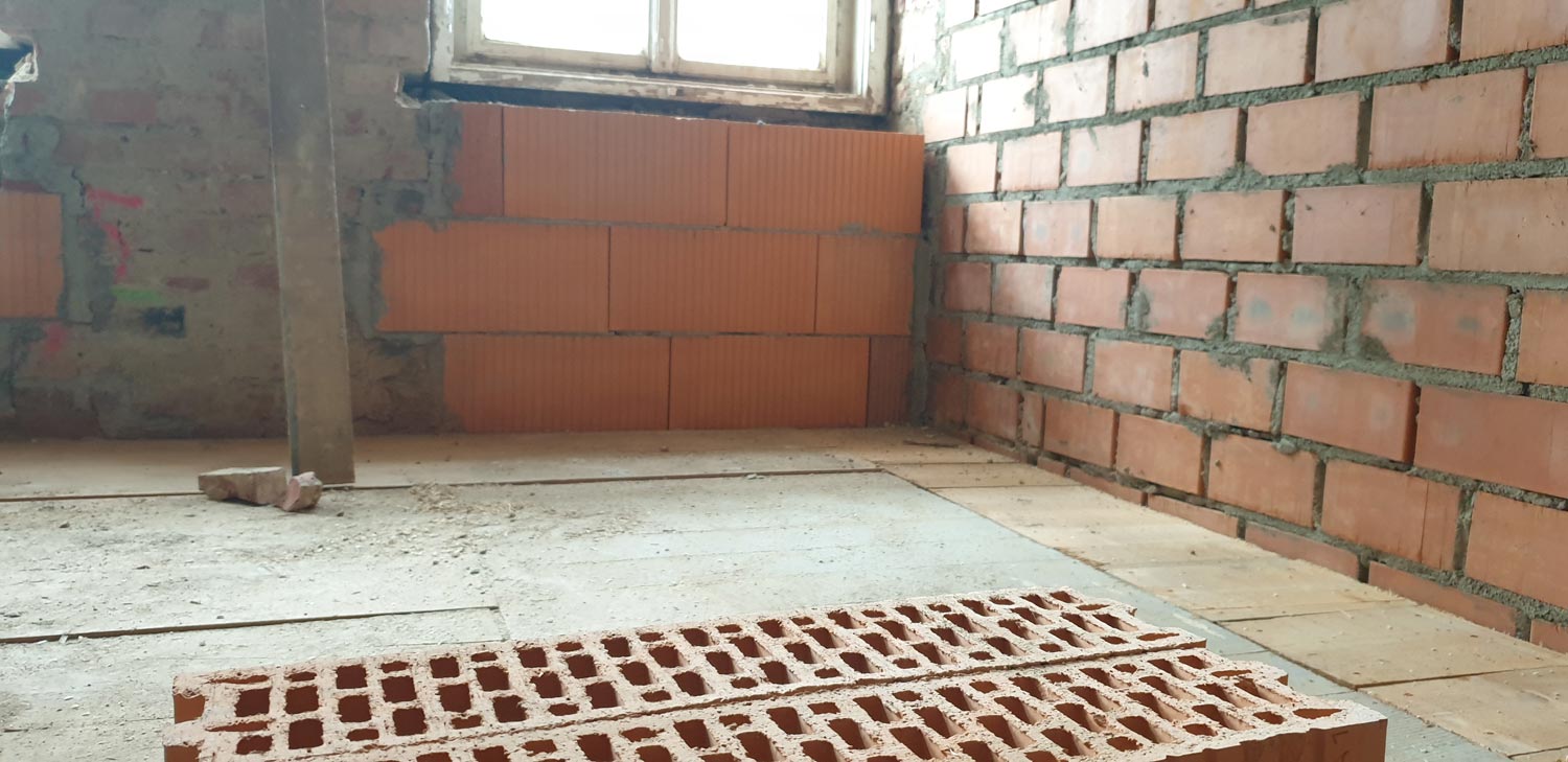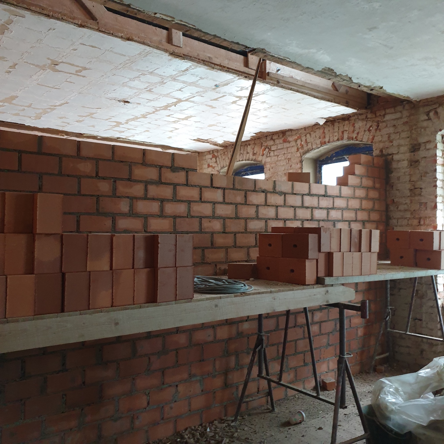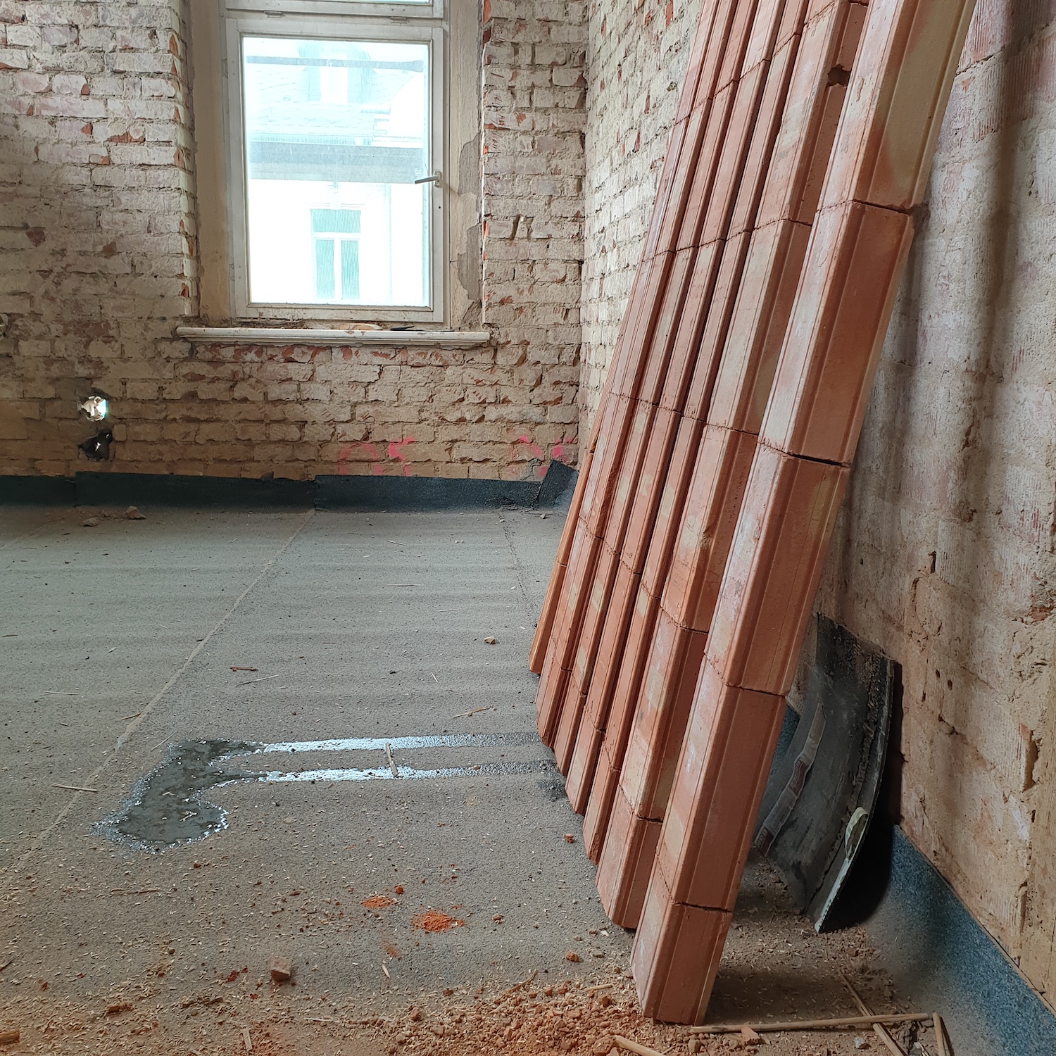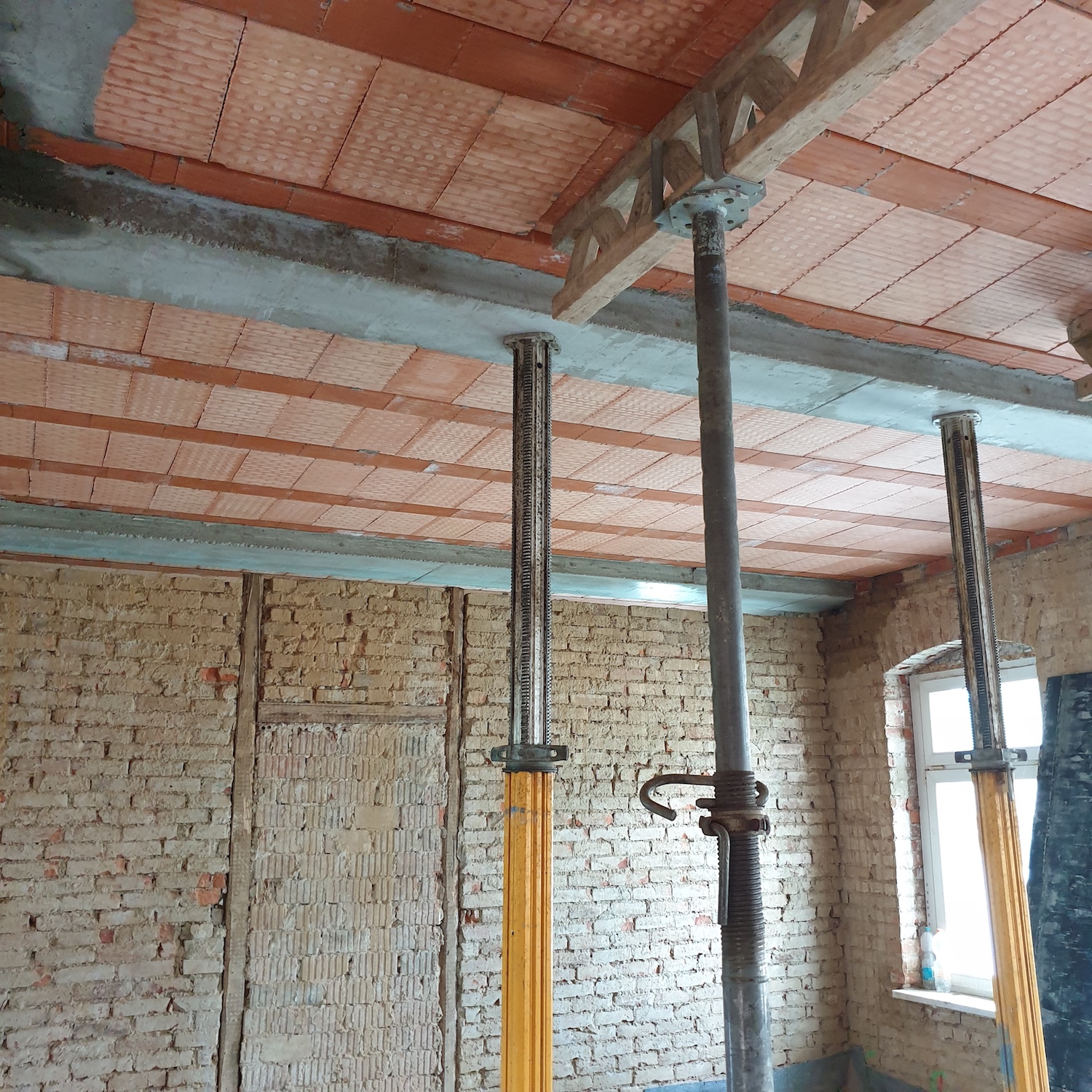 Nachdem in den letzten Monaten einige Wände neu gemauert wurden, können nun die irreparablen Holzbalkendecken durch neue Ziegeldecken ersetzt werden. Zudem haben auch die Trockenbauer begonnen, erste Trockenbauwandprofile zu erstellen, wonach dann auch die Installationen der Elektriker und HLS-Monteure beginnen werden.