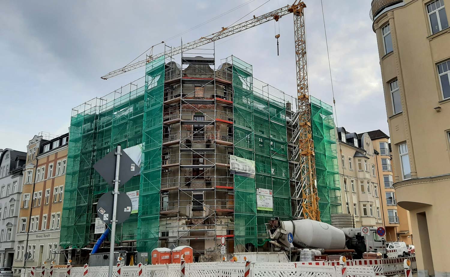 Das Objekt ist inzwischen vollständig eingerüstet. Im Inneren des Gebäudes werden die Decken saniert, nicht mehr benötigte Türöffnungen geschlossen, neue Türöffnungen hergestellt, sowie der Aufzugsschacht angelegt. Sobald es die Witterung zulässt, beginnen die Arbeiten am Dach sowie den Fassaden.