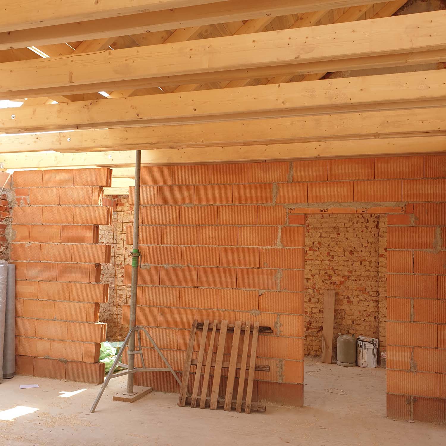 Der Baubeginn ist erfolgt und die Arbeiten starten mit den Entrümplung des Objektes, der Deckenbalkensanierung sowie den Gerüstbauarbeiten. In diesem Zusammenhang wurde die Baustelleneinrichtung erstellt und mit der Deckenfreilegung zur Deckensanierung nebst Entfernung von alten Leitungen und Putz begonnen.