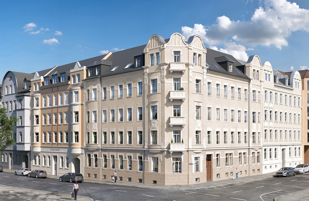 Das Eckhaus ist ein klassisches Chemnitzer Gründerzeitmehrfamilienhaus aus der Zeit um 1910 und prägt den Stadlerplatz. Es steht in einem kleinteilig gebauten Karree, bestehend aus historischen und neueren Gebäuden. Das Baudenkmal empfängt seine Bewohner über ein zweiflügliges Tor mit Oberlicht, welches in das im originalen Zustand erhaltene Foyer führt. Dies glänzt mit seinen Kassettenwänden und der stuckierten Decke. Das historische Treppenhaus setzt, mit der Architektur mit Tonnendecken, die Ausgestaltung mit Stuckornamenten und den eisernen jugendstilähnlichen Treppengeländern, die hohe Qualität der Fassadengestaltung im Gebäude fort. Aufwendig gearbeitete historische Wohnungseingangstüren, stuckierte Decken und großzügige Raumgestaltung erzählen vom Anspruch der Erbauer des Hauses. Das historische und denkmalgeschützte Objekt bietet nach der umfassenden Kernsanierung sowie der energetischen Aufwertung zum „KfW-Effizienzhaus-Denkmal“, abschließend 16 exklusive sowie komfortable Wohneinheiten mit einer Größe von ca. 28,50 m² bis ca. 118,50 m². Die Wohnungen verfügen über attraktive sowie individuelle Grundrisse. Die Baubeschreibung sieht u. a. den Einbau wertiger Parkettböden, einer Fußbodenheizung, strukturierter Netzwerkverkabelung sowie moderner Sanitär- und Fliesenlinien von namenhaften Herstellern vor. Ein moderner Aufzug hält vom Erdgeschoss bis in das Dachgeschoss. Das Wohnkonzept, besticht neben den vielfältigen Wohneinheiten insbesondere durch eine optimale Lage und eignet sich gleichermaßen für viele Nutzergruppen, wie Singles, Paare oder Familien.