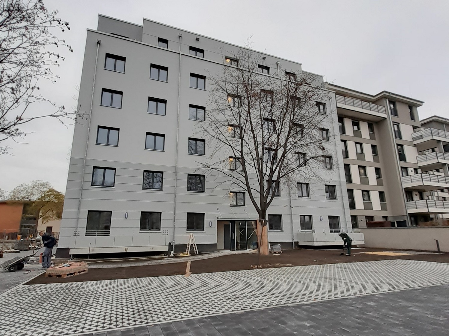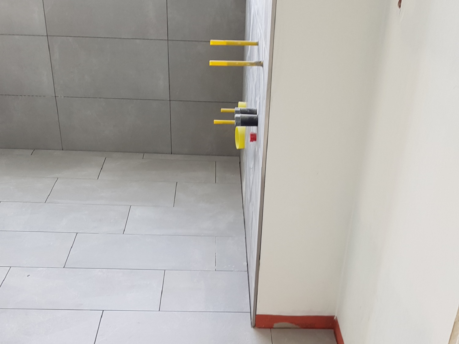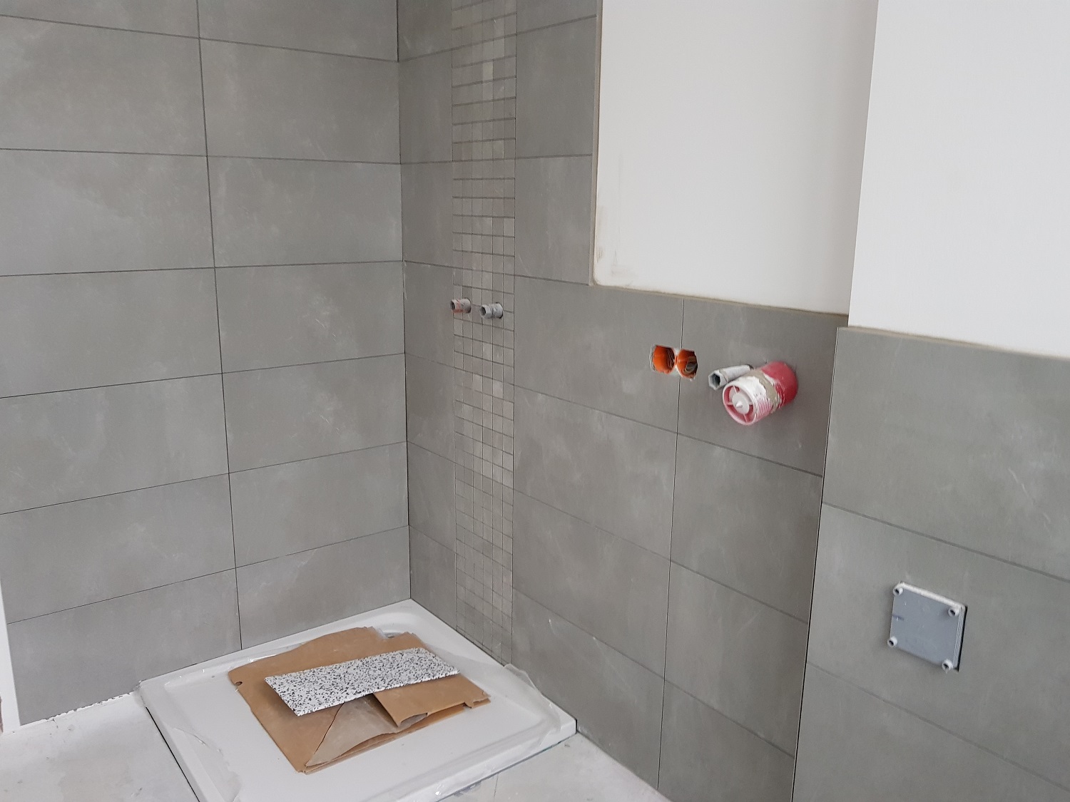 Das Ziel der Fertigstellung des Neubaus rückt näher. Der Estrich wurde in jeder Wohnung verbaut! Seit wenigen Tagen sind die Fliesenleger und die Maler fleißig am Werkeln. In den ersten Wohneinheiten werden nun die Bäder mit Feinsteinzeugfliesen im Dünnbettklebemörtel auf entsprechender Abdichtung verlegt.