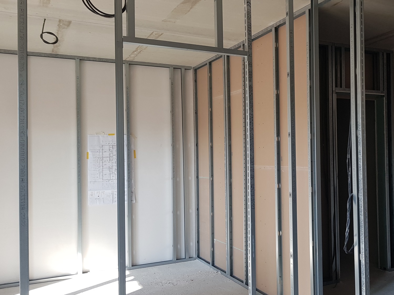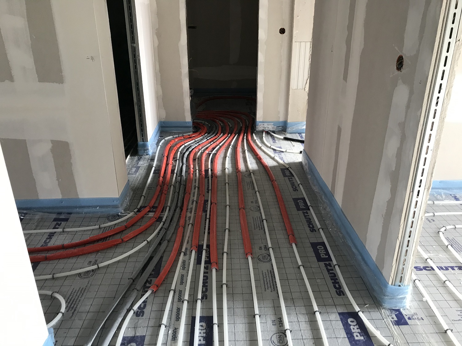 Die Arbeiten im Bereich Rohinstallation Sanitär- und Elektroinstallation sind in den meisten Wohnungen bereits abgeschlossen. Es wurden Kabel, Fallrohre, Heizungs- und Wasserleitungen verlegt. In den Bädern wird zusätzlich zur Fußbodenheizung ein Heizkörper als Handtuchtrockner ausgeführt, welcher parallel zur Fußbodenheizung angeschlossen ist. Derzeit wird nun an der Fußbodendämmung, Tackerplatten sowie das verlegen der Fußbodenheizung gearbeitet, sodass in Kürze der Estrich fließen kann.