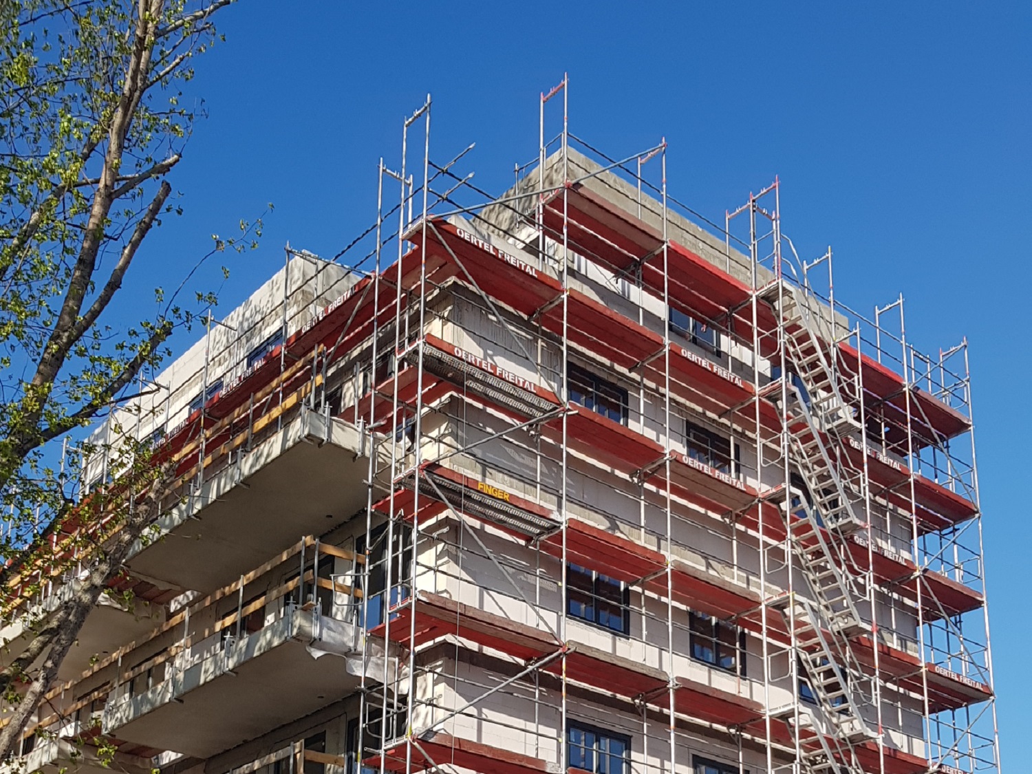 Höhenangst ist aktuell in der Uhlandstraße 33 fehl am Platz. Mittlerweile befinden sich die Arbeiten im 4. Obergeschoss in luftiger Höhe. Aktuell wird die 6. Geschossdecke betoniert sowie das letzte Geschoss vorbereitet. In den unteren Geschossen wurde bereits mit dem Einbau der Fenster begonnen und die ersten Rohinstallationen erfolgten.
