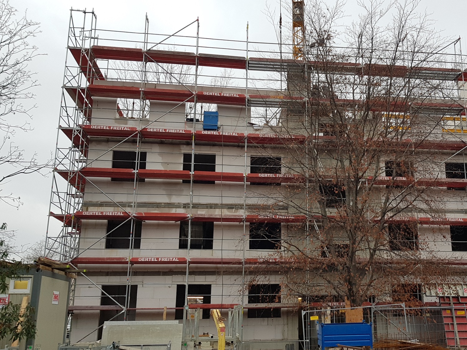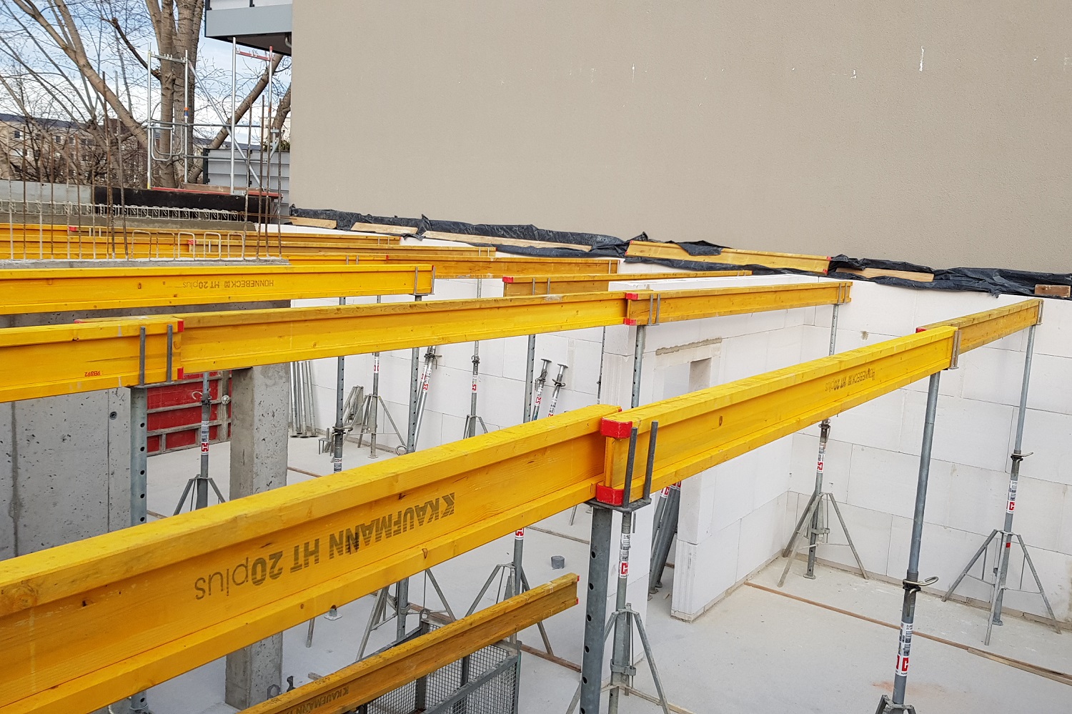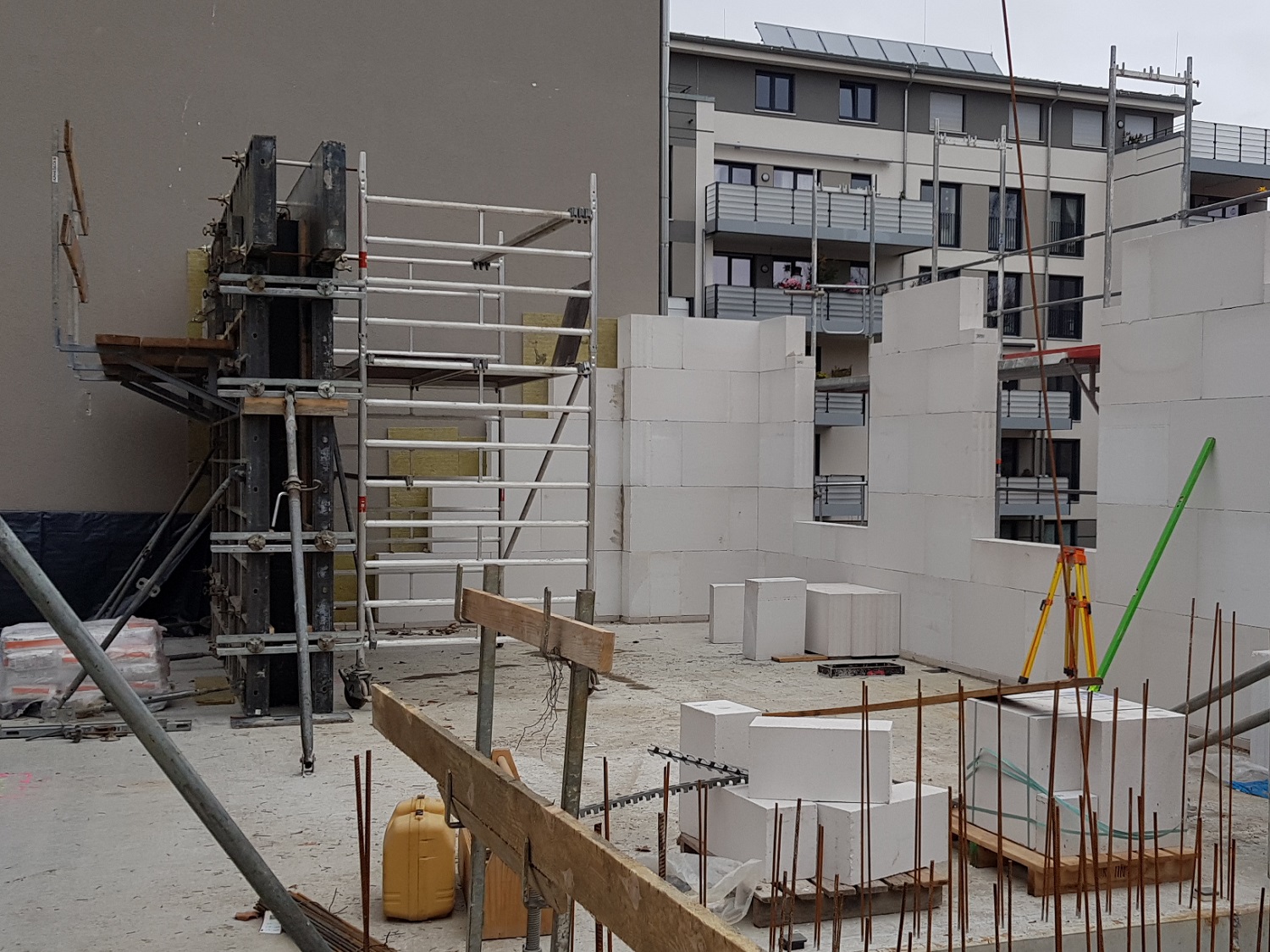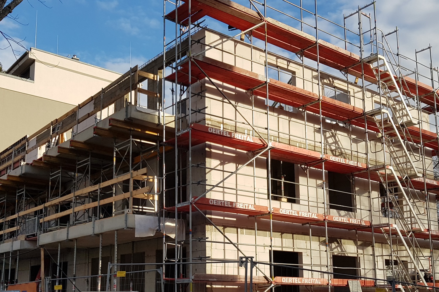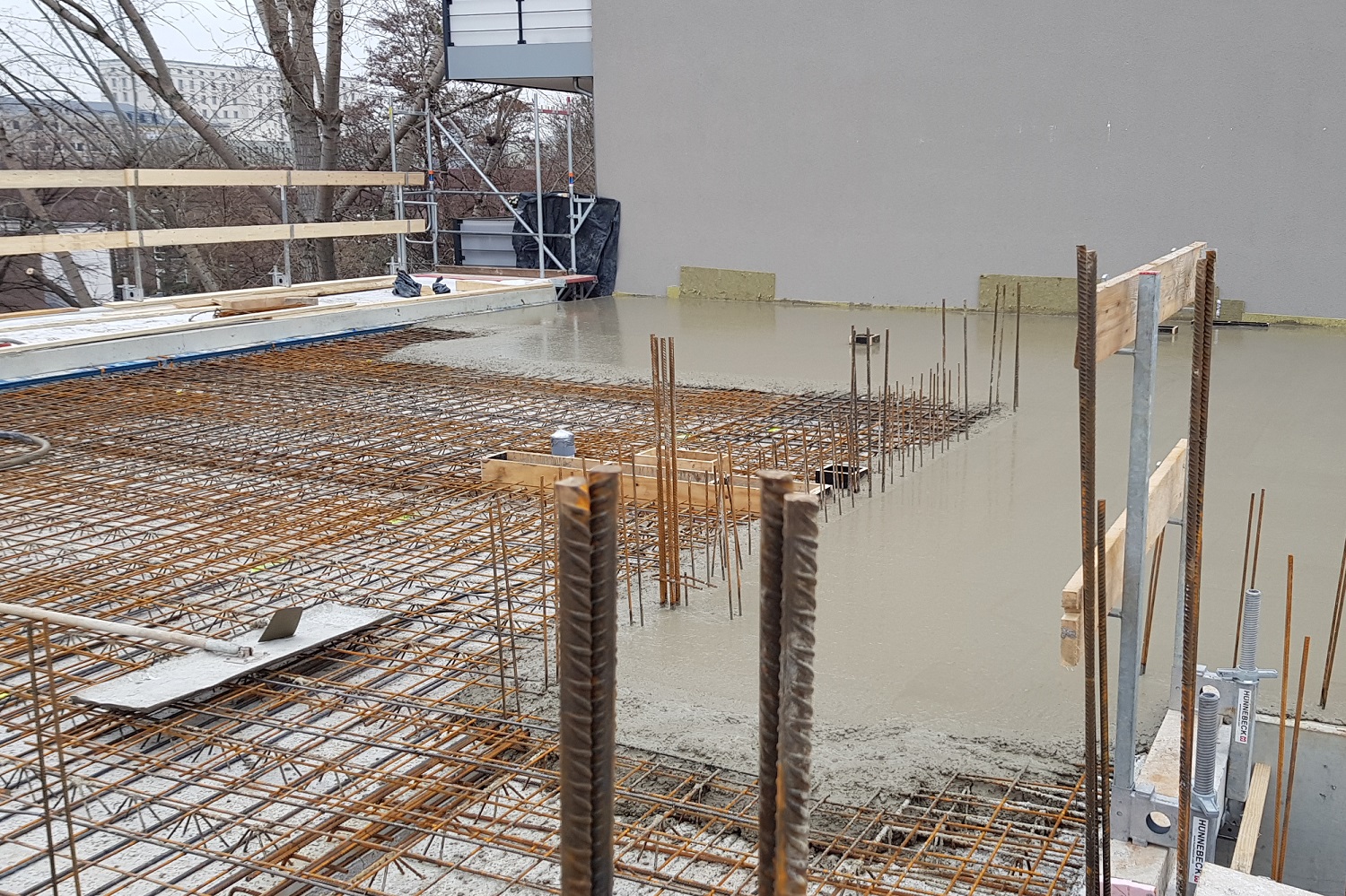 Nach erfolgreicher Vollendung des 2. Obergeschosses ist das eingespielte Team aktuell damit beschäftig das 3. Obergeschoss zu errichten. Der Februar zeigte neben sehr gefährlichen Stürmen auch, zur Freude des Rohbauteams, ein wenig Sonnenstrahlen, sodass die Bauarbeiten zügig vorangingen.