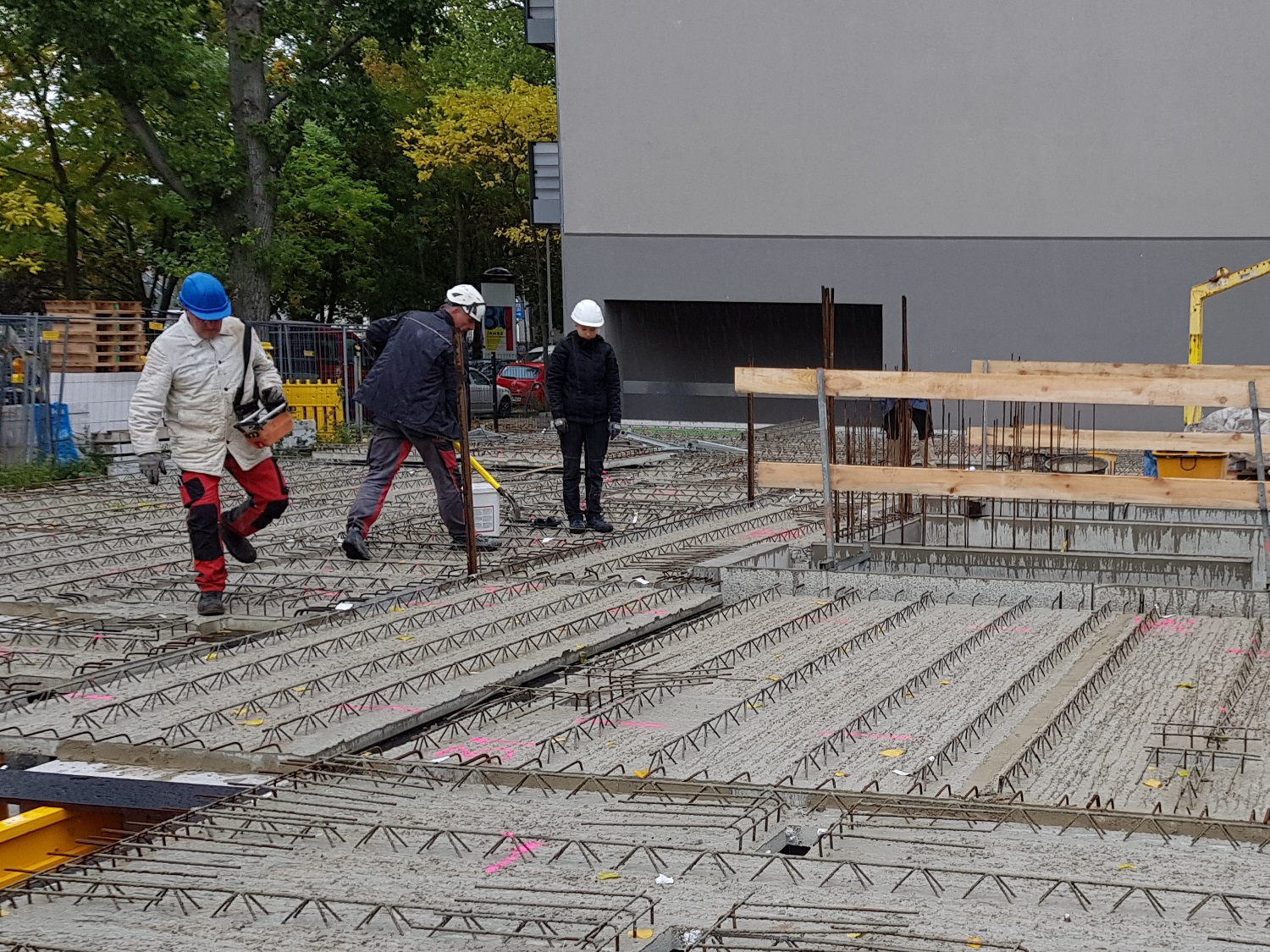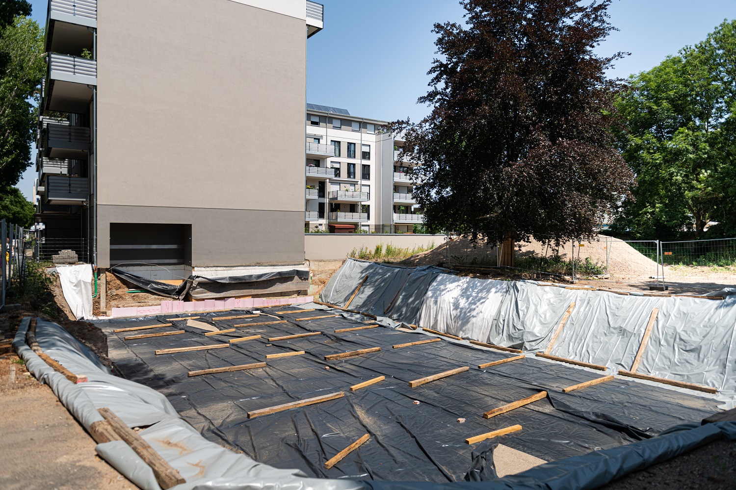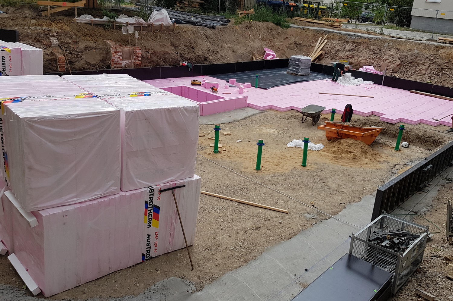 Es ist offensichtlich, die Gründung des Objektes Uhlandstraße 33 hat begonnen. Die Gründung ist der Übergang vom Bauwerk zum Erdboden und erfolgt in diesem Fall als tragende Bodenplatte auf Perimeterdämmung. Inzwischen ist die Herstellung der Bodenplatte erfolgt. Derzeit werden die Wände des Kellergeschosses errichtet.