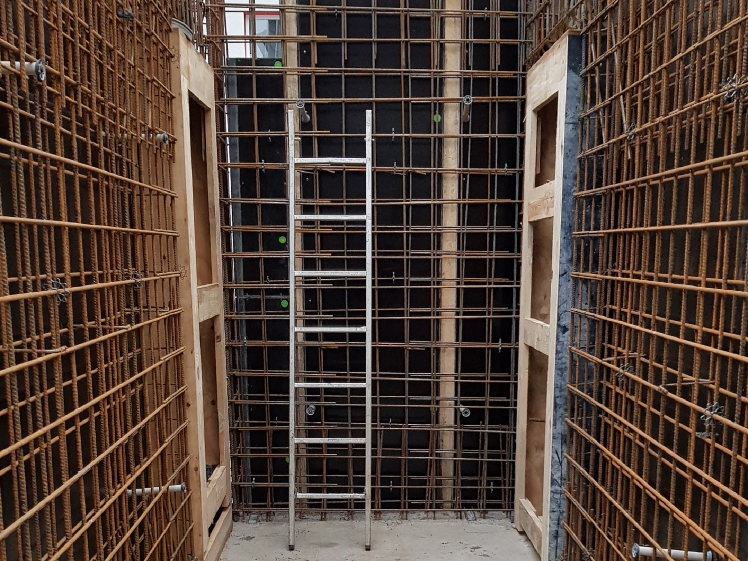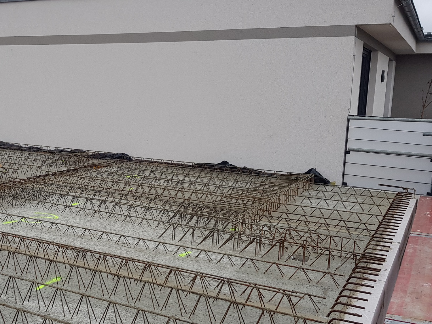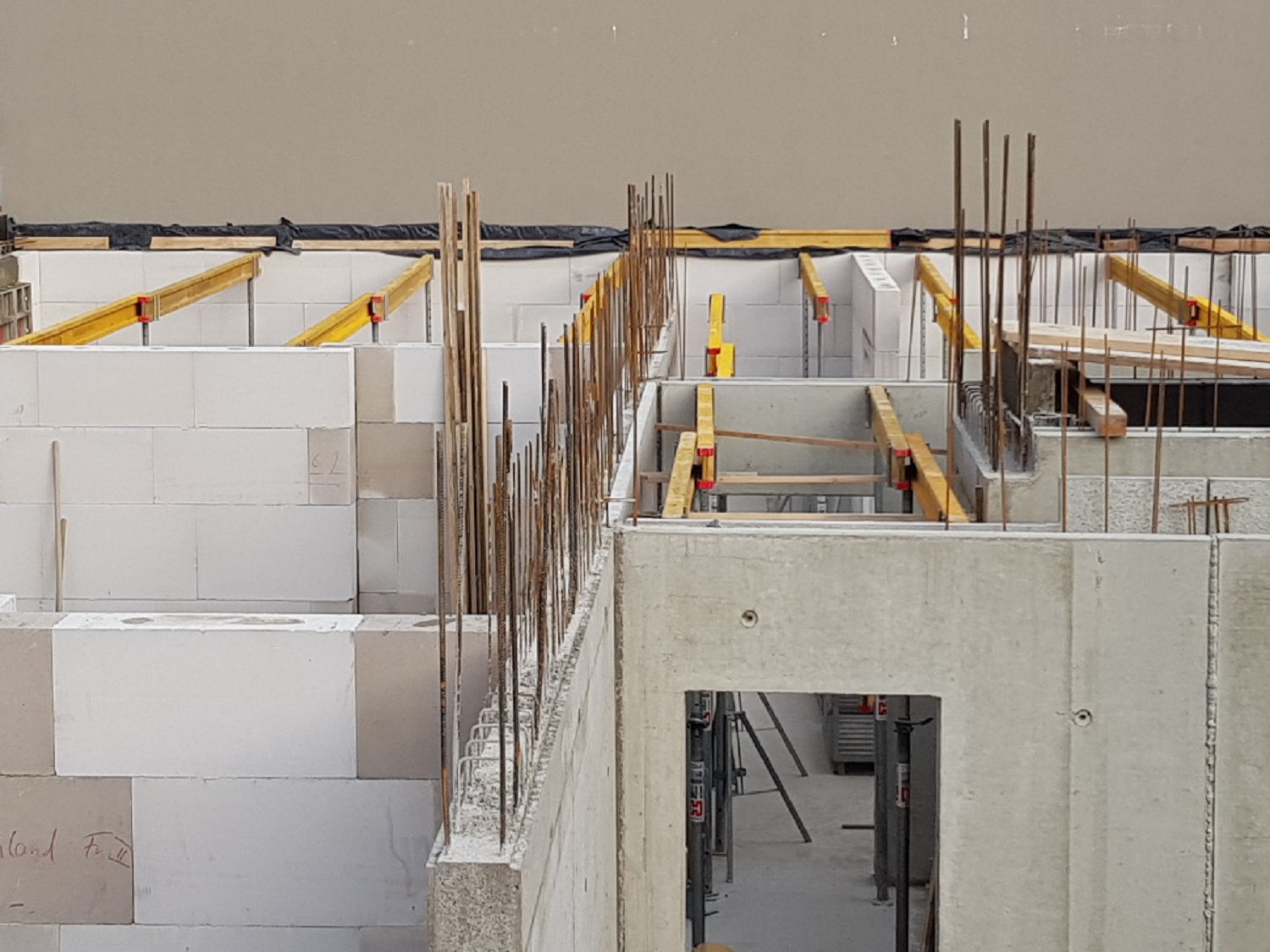 In Handarbeit wird der Bewehrungsstahl vor Ort entsprechend der Statik hergestellt und an der Schalung fixiert. Nach Vorbereitung der Schalungen für einen Teil der Innen- sowie Außenwände im Erdgeschoss, erfolgt anschließend die Betonage. Parallel dazu werden die übrigen Mauerwerksbereiche im Erdgeschoss mit Kalksandstein-Plansteinen errichtet. Der nächste Schritt ist die Herstellung der Decke über dem Erdgeschoss.