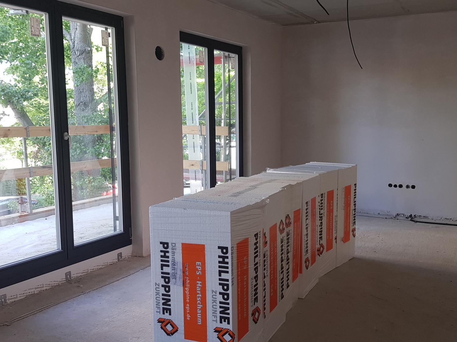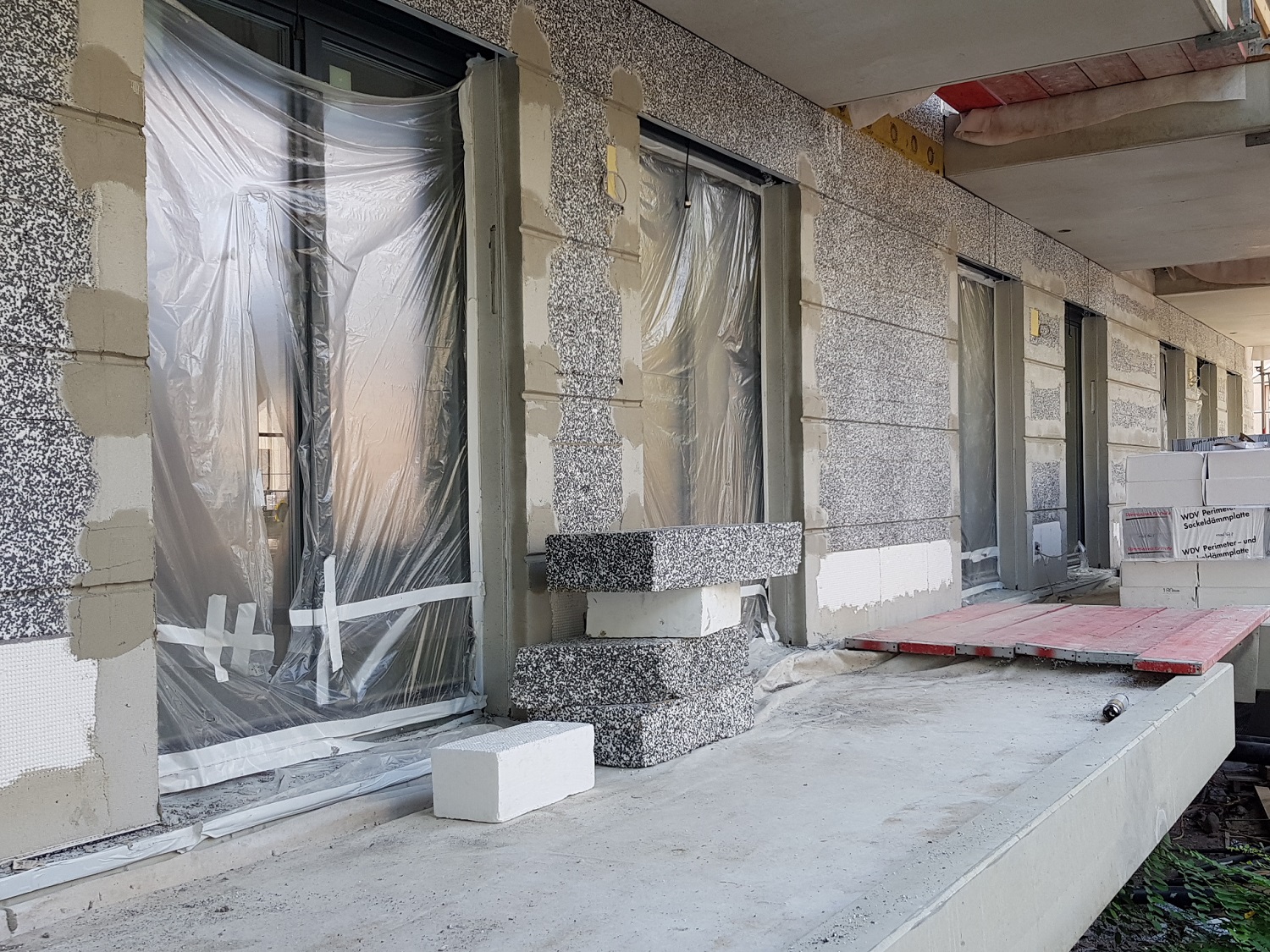 Mit dem Einbau des Estrichs wurde in den ersten Einheiten begonnen! Mit jedem Schritt liegt dieser nun unter unseren Füßen, „beherbergt“ Kabel und Rohre und ist somit der Untergrund für die Fußbodenbeläge. Die Fassadendämmung ist weitgehend fertiggestellt. Im Anschluss wird die Armierungsschicht auf die Dämmung aufgebracht und mit einem Oberputz versehen. Demnächst werden Fliesenleger und Maler ihre Arbeit aufnehmen.